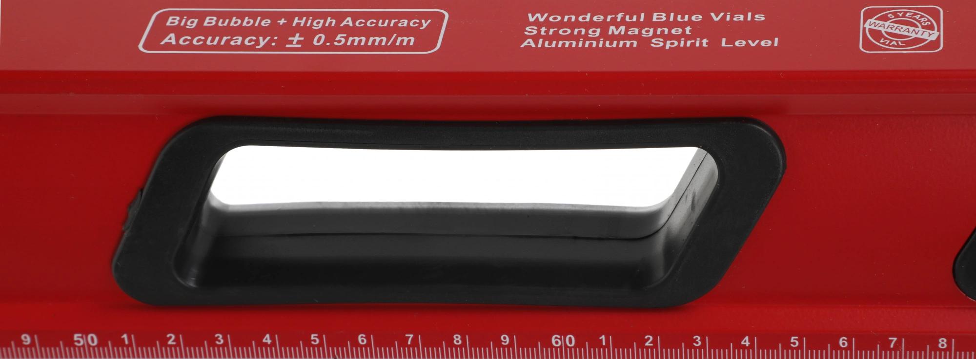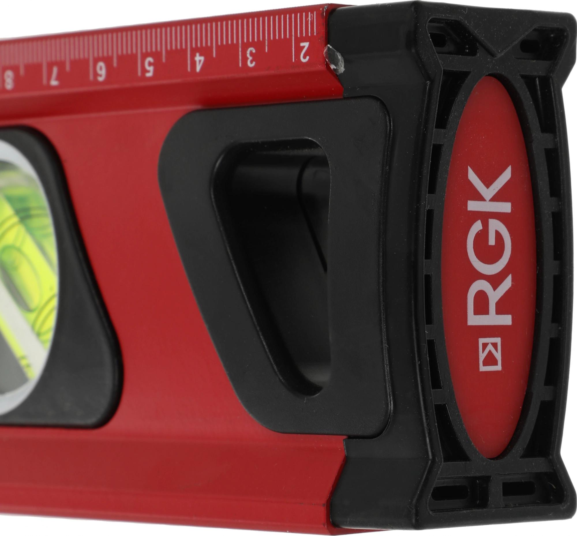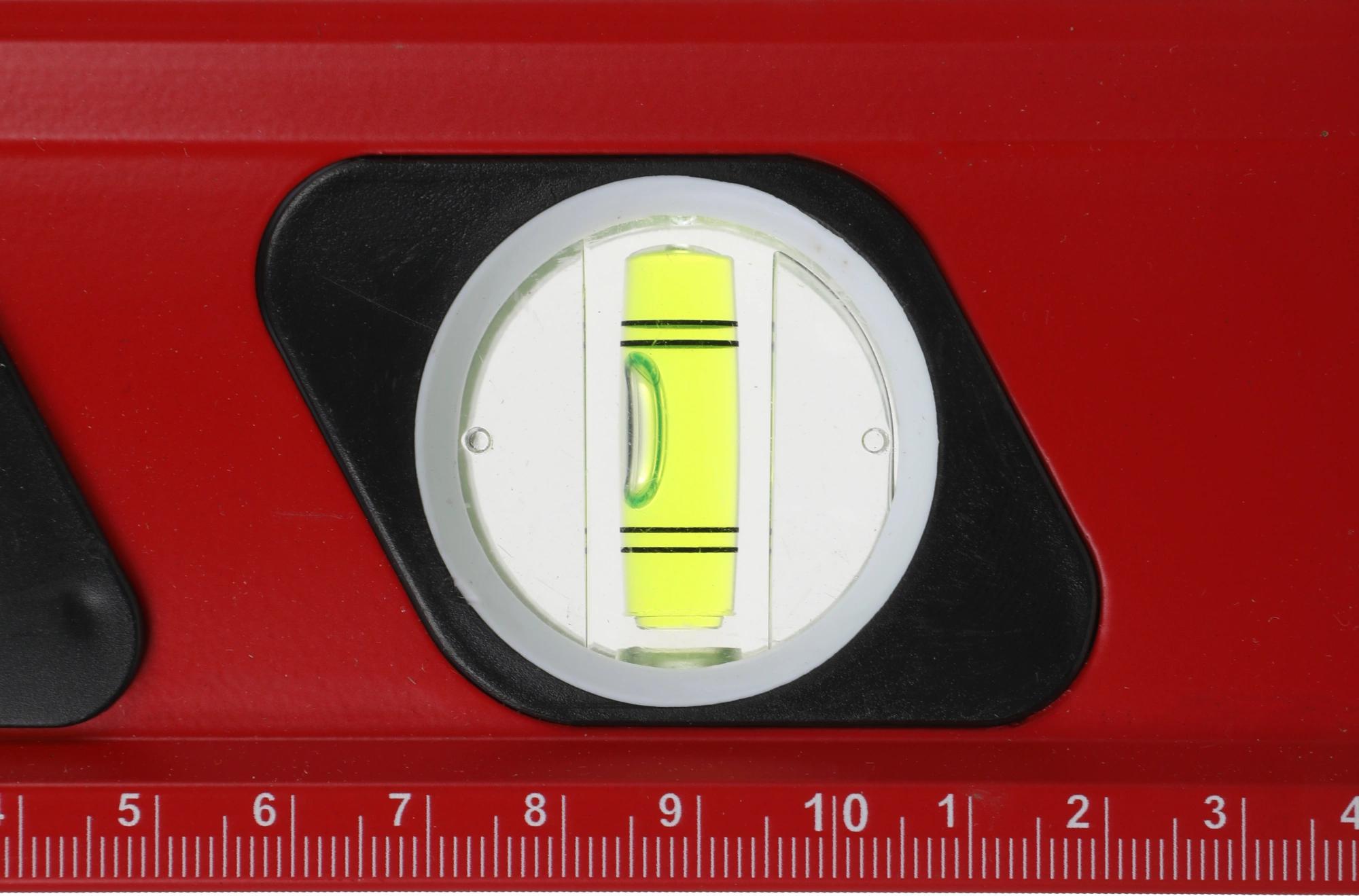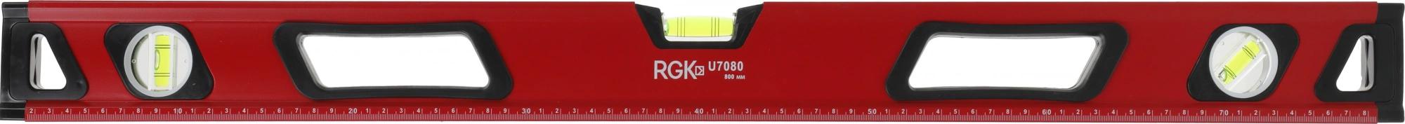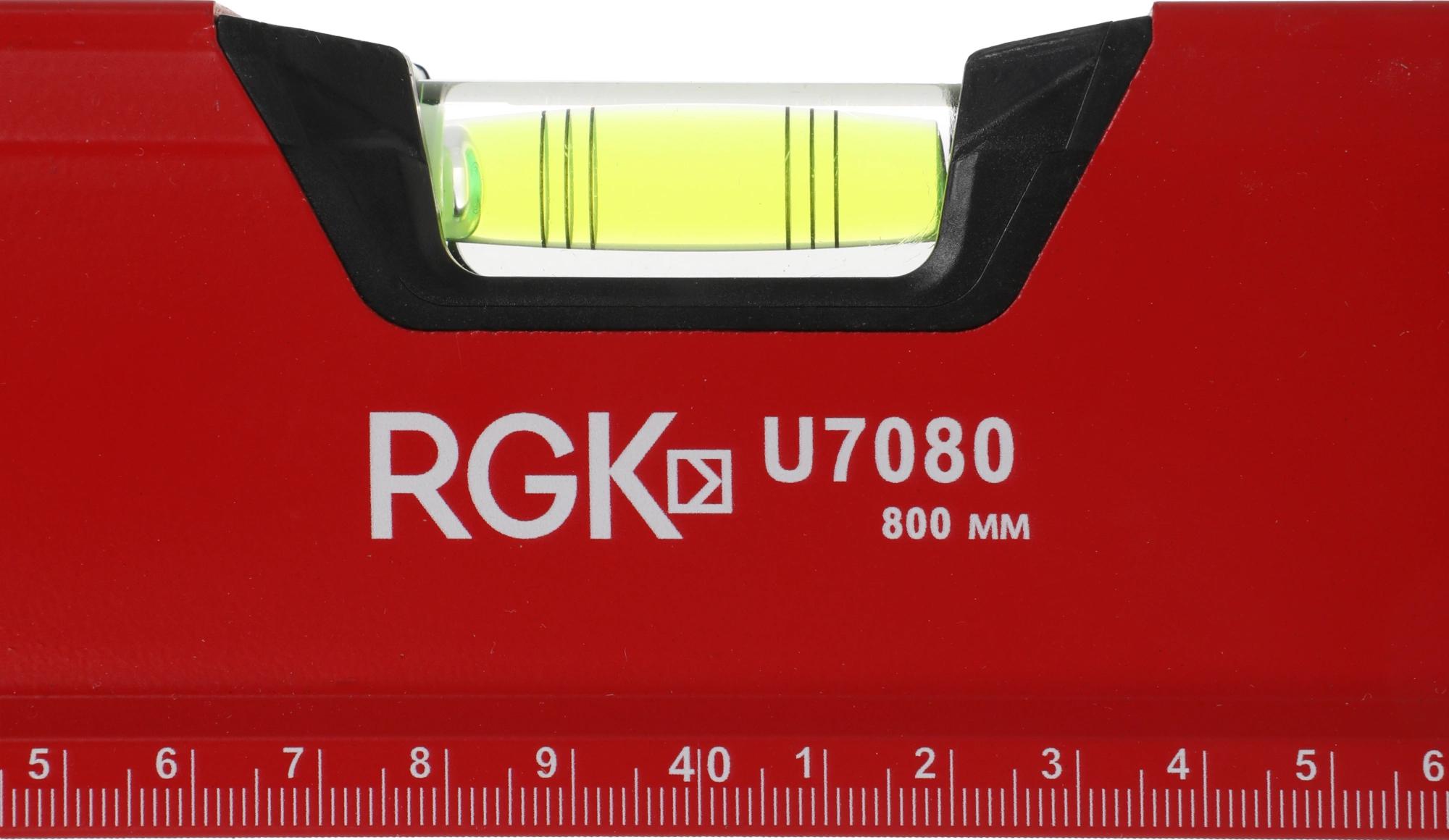 Строительный уровень RGK U7080 длиной 80 см. оснащен магнитом для крепления на металлических поверхностях, чтобы освободить руки при проведении разметки. Специальное смотровое окошко на узком ребре покажет положение пузырька вертикального уровня при измерениях в труднодоступных местах.