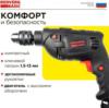 Дрель; вспомогательная рукоятка; ограничитель глубины сверления; инструкция по эксплуатации; коробка (упаковка).