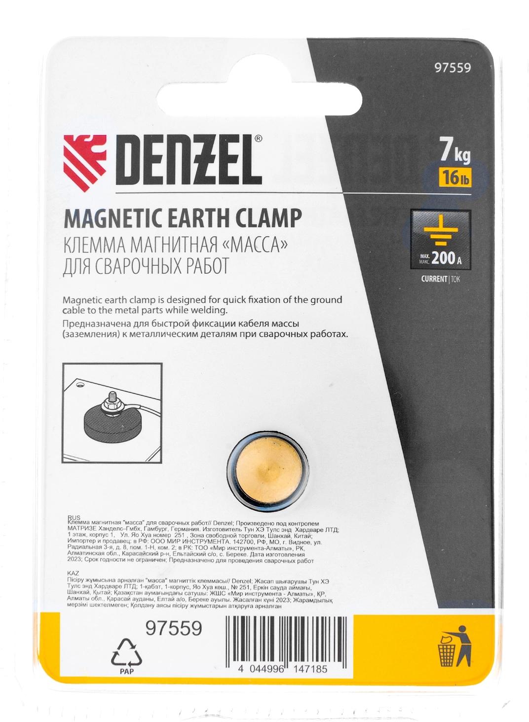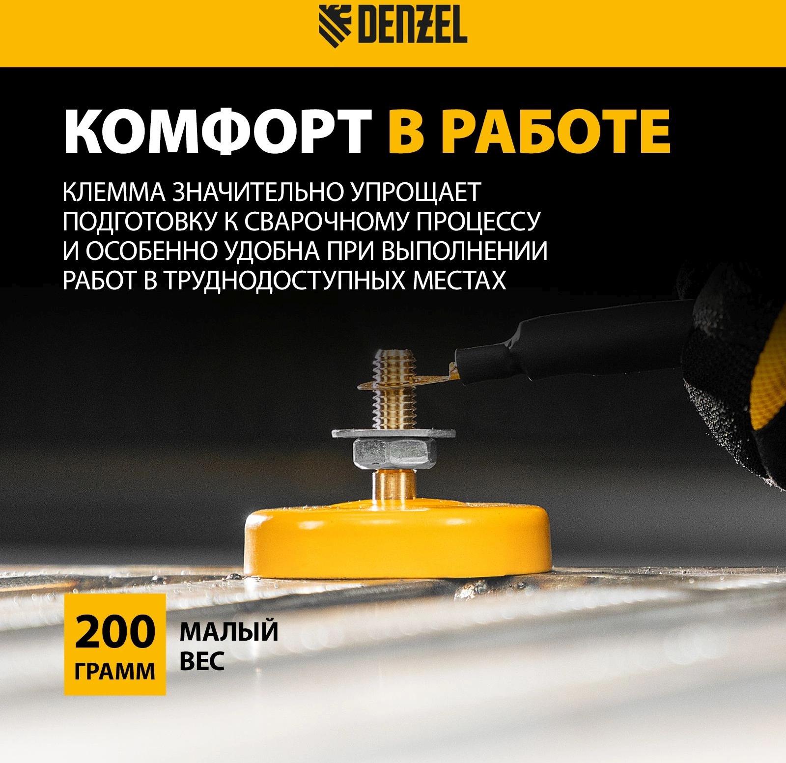 Магнитная клемма Denzel 97559 с максимальным током 200 А предназначена для того, чтобы соединять рабочий электрод с поверхностью обрабатываемого материала кабелем заземления.