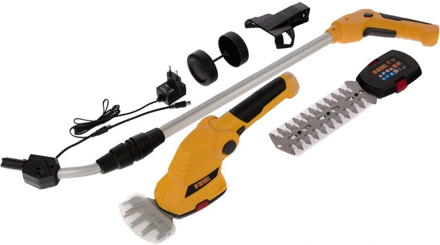 Аккумуляторные садовые ножницы (со встроенным аккумулятором), блок-переходник, режущий модуль для травы быстросъемный, режущий модуль для кусторезов быстросъемные, зарядное устройство, телескопическая ручка с колесной колодкой, инструкция с гарантийным талоном.