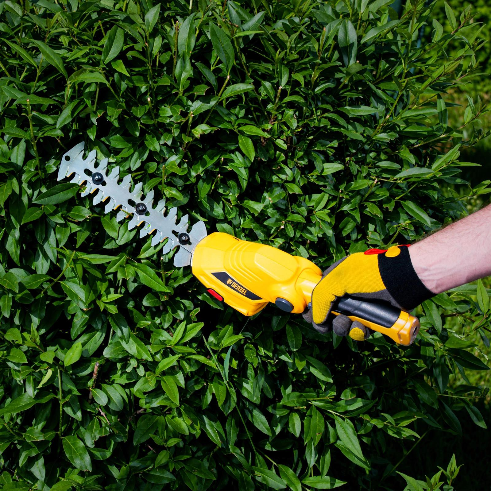 Ножницы-кусторез аккумуляторные, с обрезиненной рукояткой для комфортного хвата. Сменные лезвия дают возможность подрезать траву и ухаживать за кустарником.