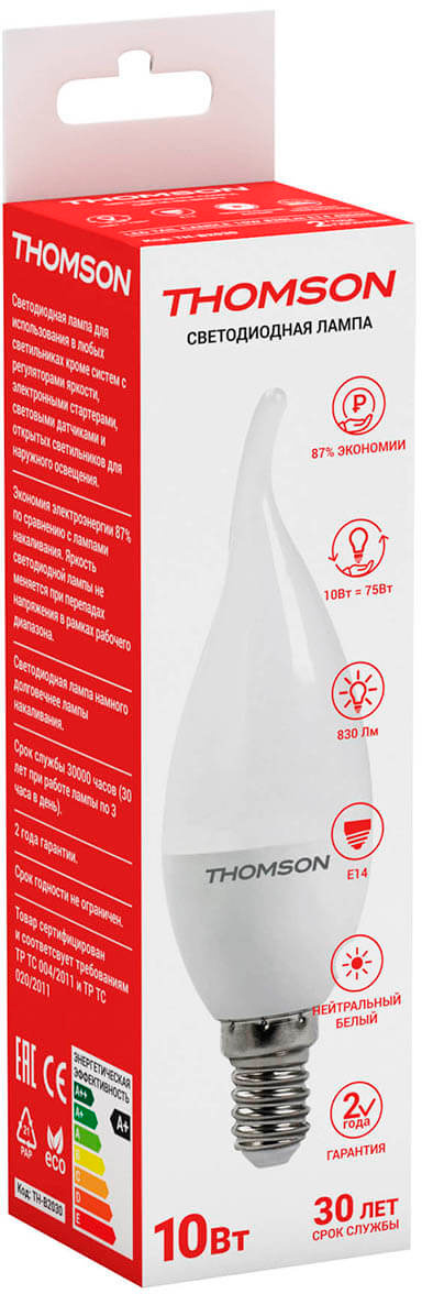 Светодиодная лампочка в форме свечи на ветру с цоколем E14 и размерами 130 мм по высоте и диаметром в 40 мм обладает мощностью в 10 W, благодаря чему она может осветить 4 кв. м. Цветовая температура – 4000 К, т.е. белый свет, подходящий для рабочего настроя