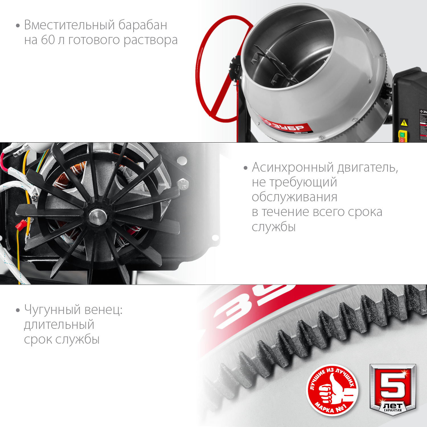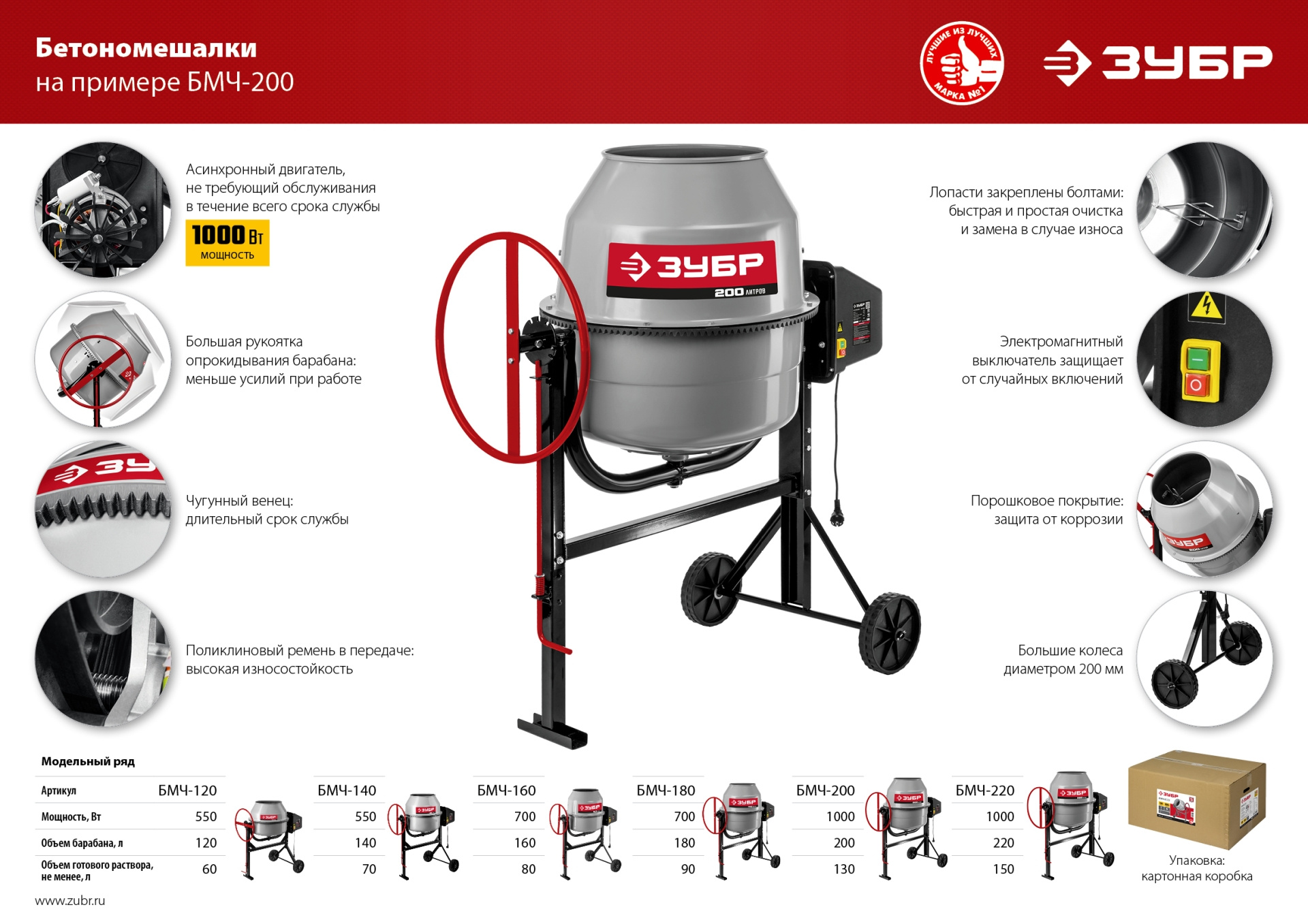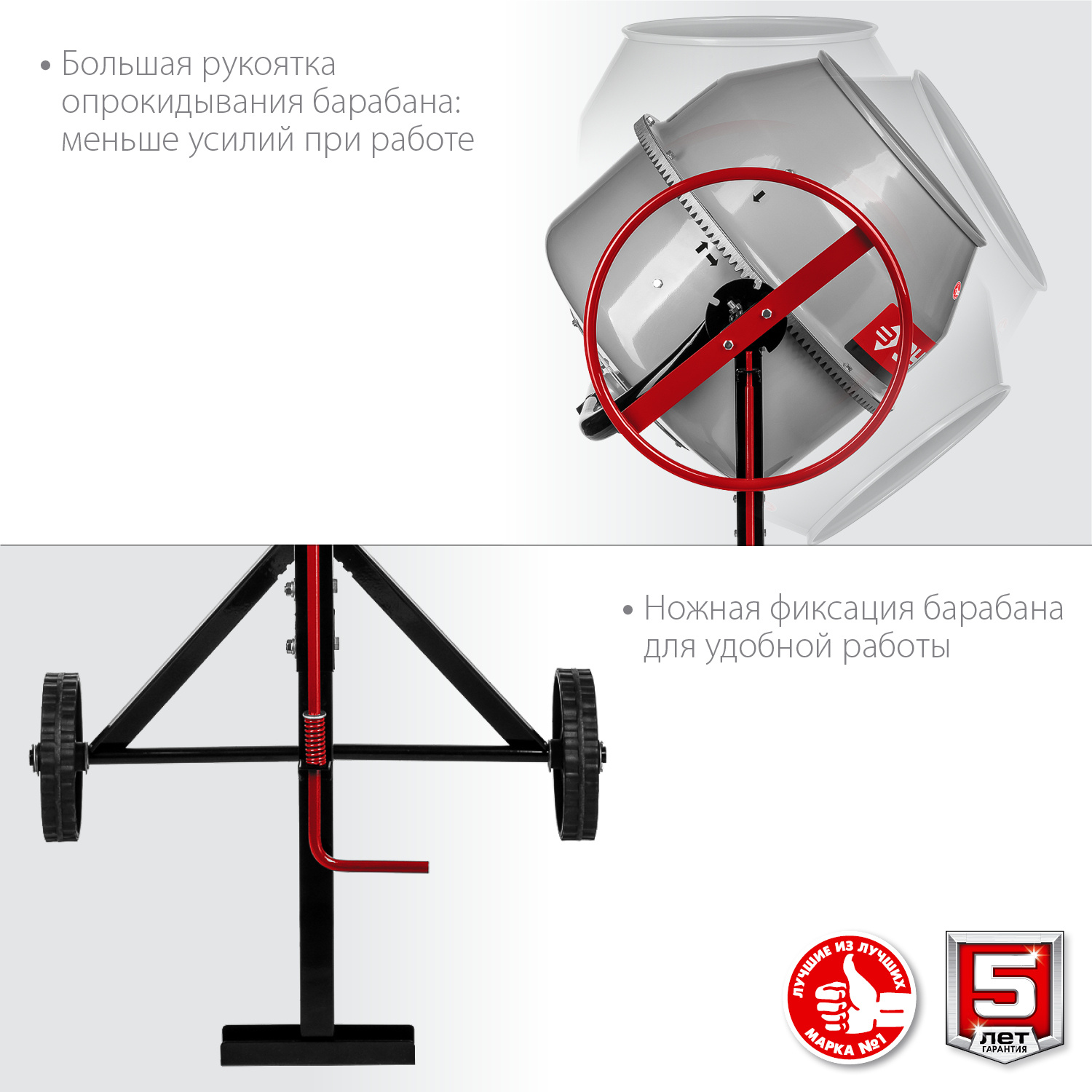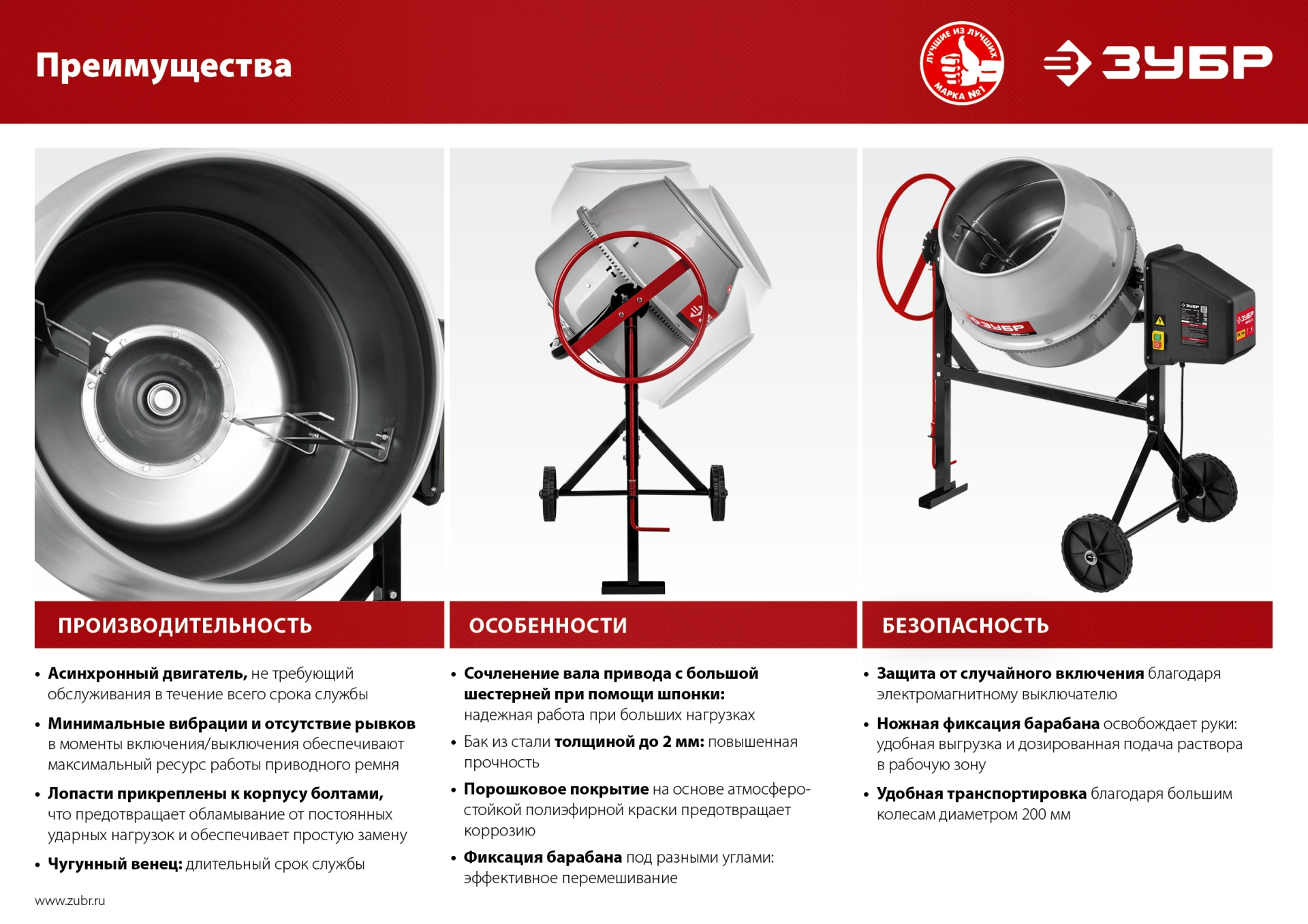 Эффективный инструмент, вместительным барабаном, удобным регулятором угла наклона барабана и надежным чугунным венцом в передаче является незаменимым помощником в строительных работах в быту и на стройплощадке.