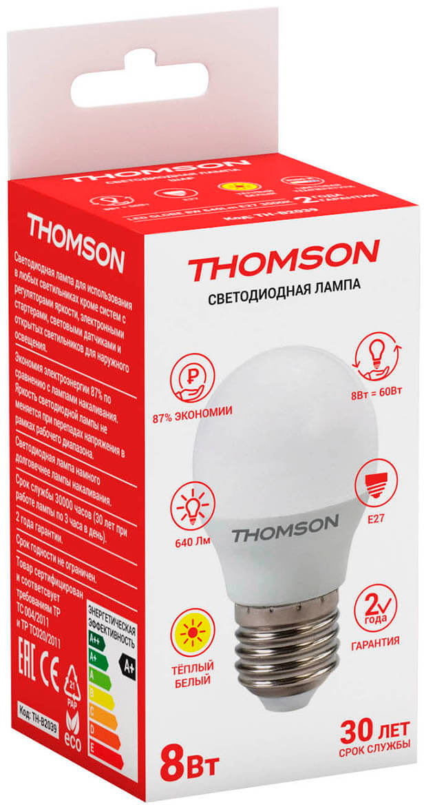 Лампа светодиодная Thomson TH-B2039 8Вт цок.:E27 шар 220B св.свеч.бел.теп. Globe