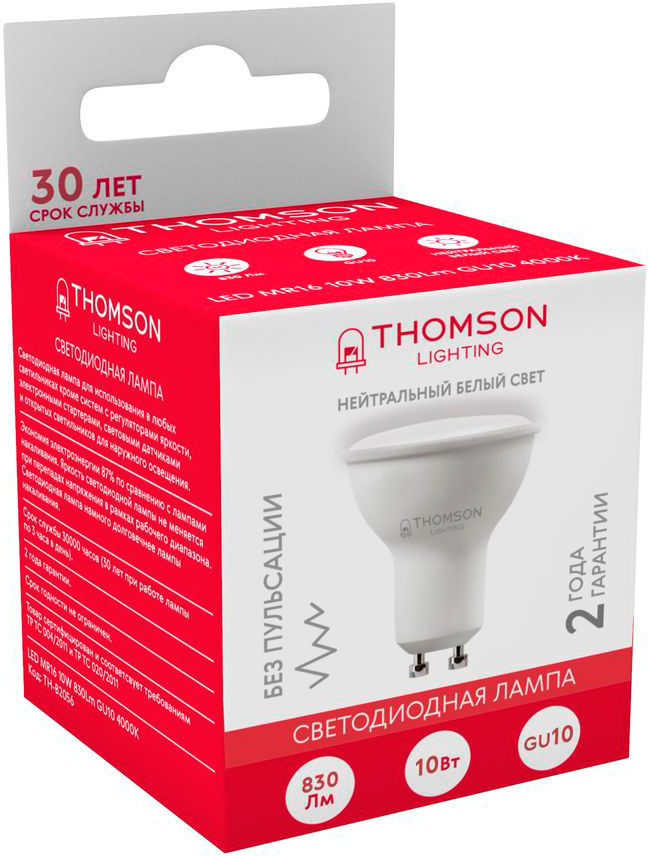 Лампа светодиодная Thomson TH-B2056 10Вт цок.:GU10 полусф. 220B св.свеч.бел.нейт. MR16 (упак.:1шт)
