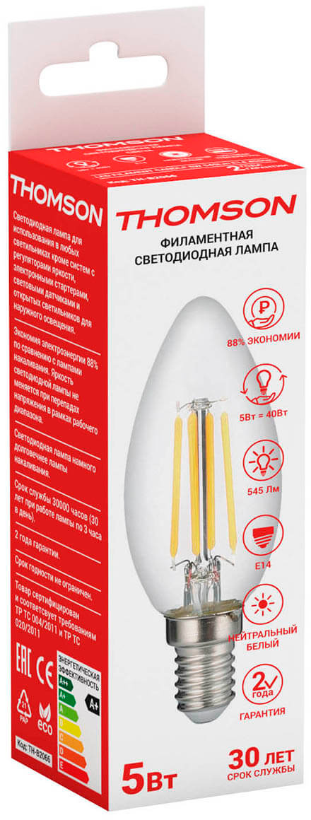 Лампа филам. Thomson Filament TH-B2066 5Вт цок.:E14 свеча 220B 4500K св.свеч.бел.нейт. Candle (упак.:1шт)