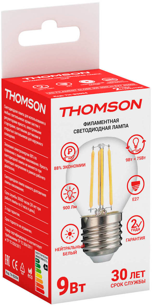 Лампа филам. Thomson Filament TH-B2094 9Вт цок.:E27 шар 220B св.свеч.бел.нейт. Globe (упак.:1шт)