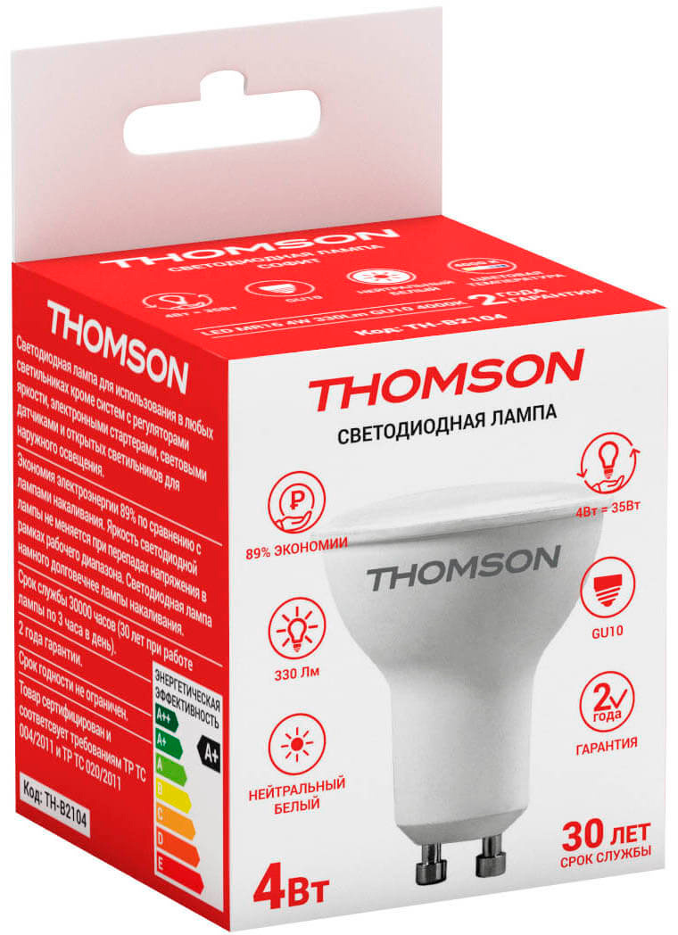 Лампа светодиодная Thomson TH-B2104 4Вт цок.:GU10 рефлек. 220B св.свеч.бел.нейт. MR16 (упак.:1шт)