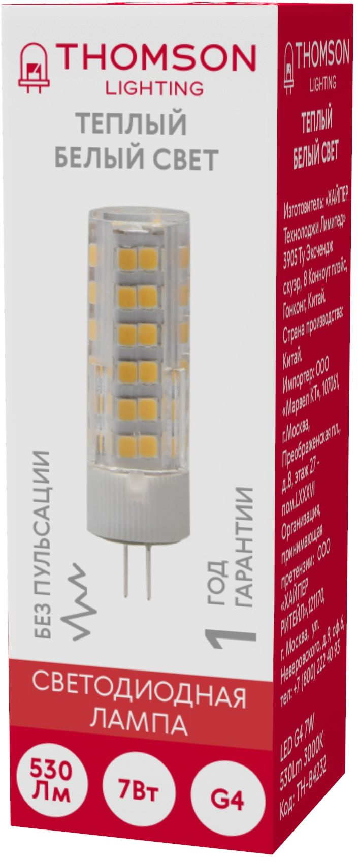 Лампа светодиодная Thomson TH-B4232 7Вт цок.:G4 капсул. 220B 3000K св.свеч.бел.теп. (упак.:1шт)
