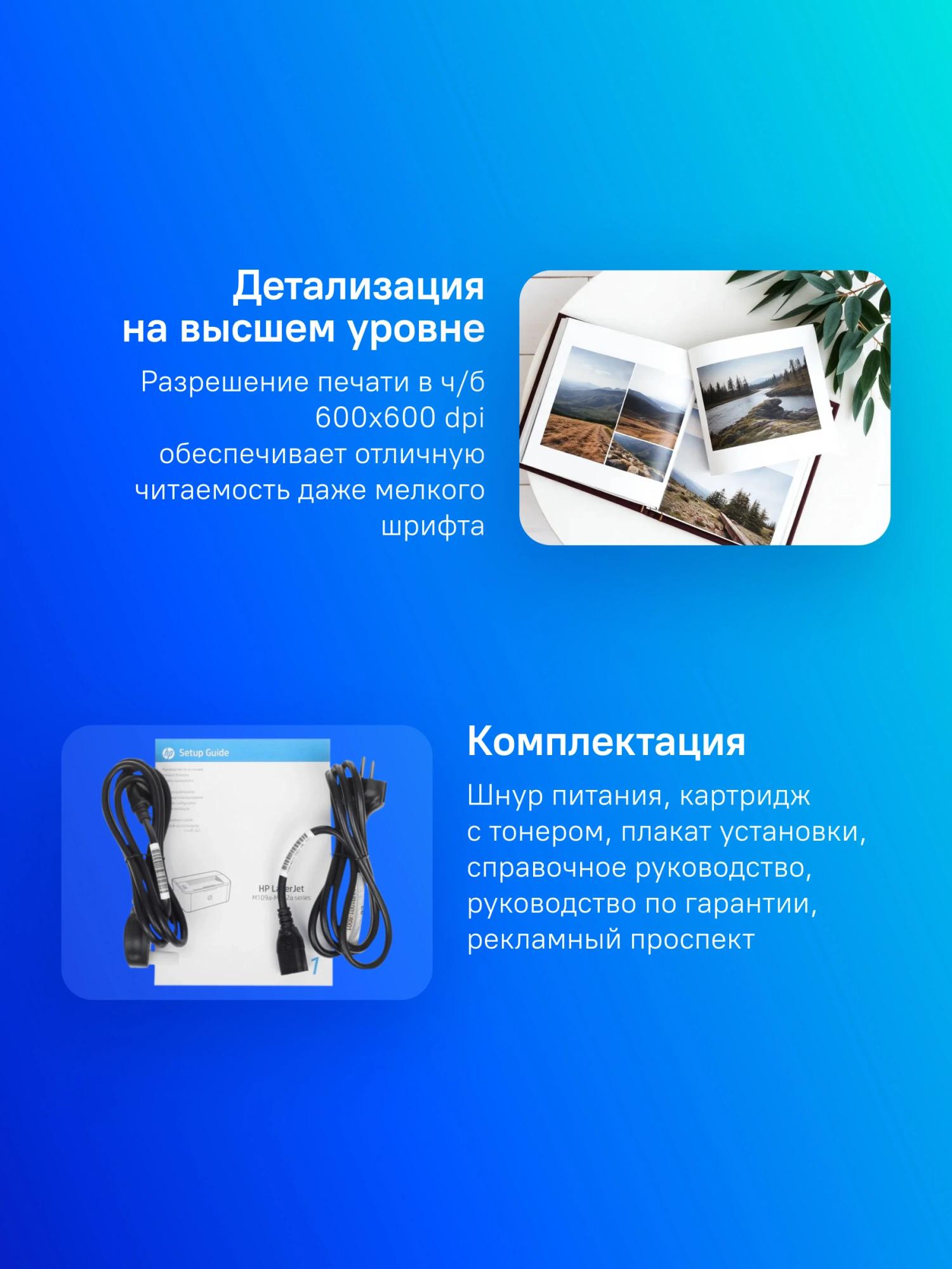 Принтер HP LaserJet M111a. Шнур питания. Картридж с тонером (~500 страниц). Плакат установки. Справочное руководство. Руководство по гарантии. Рекламный проспект.