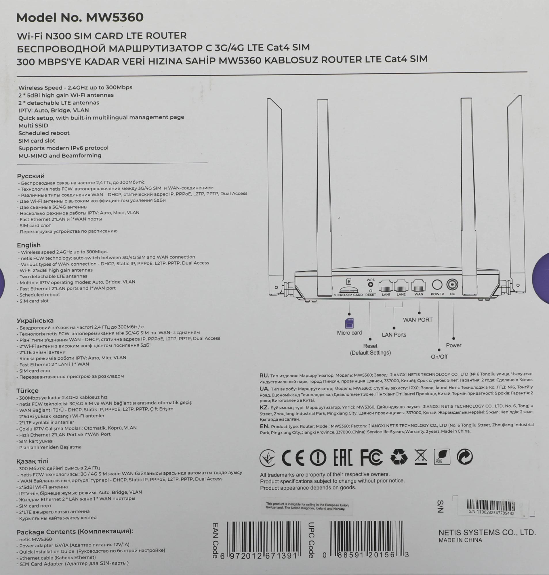 Роутер MW5360. Адаптер питания 12В/1А. Инструкция по быстрой настройке (многоязыковая).