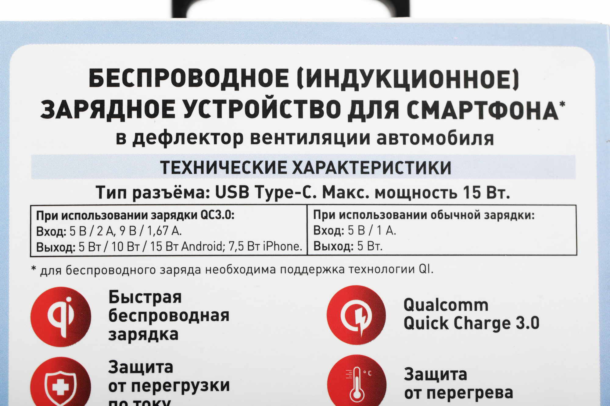 Беспроводное (индукционное) зарядное устройство для смартфона, в дефлектор вентиляции автомобиля.В комплекте: держатель с функцией беспроводной зарядки (БЗУ), металлическое кольцо, крепление в дефлектор вентиляции автомобиля, кабель Type-C, инструкция. Максимальная мощность: 15 Вт.