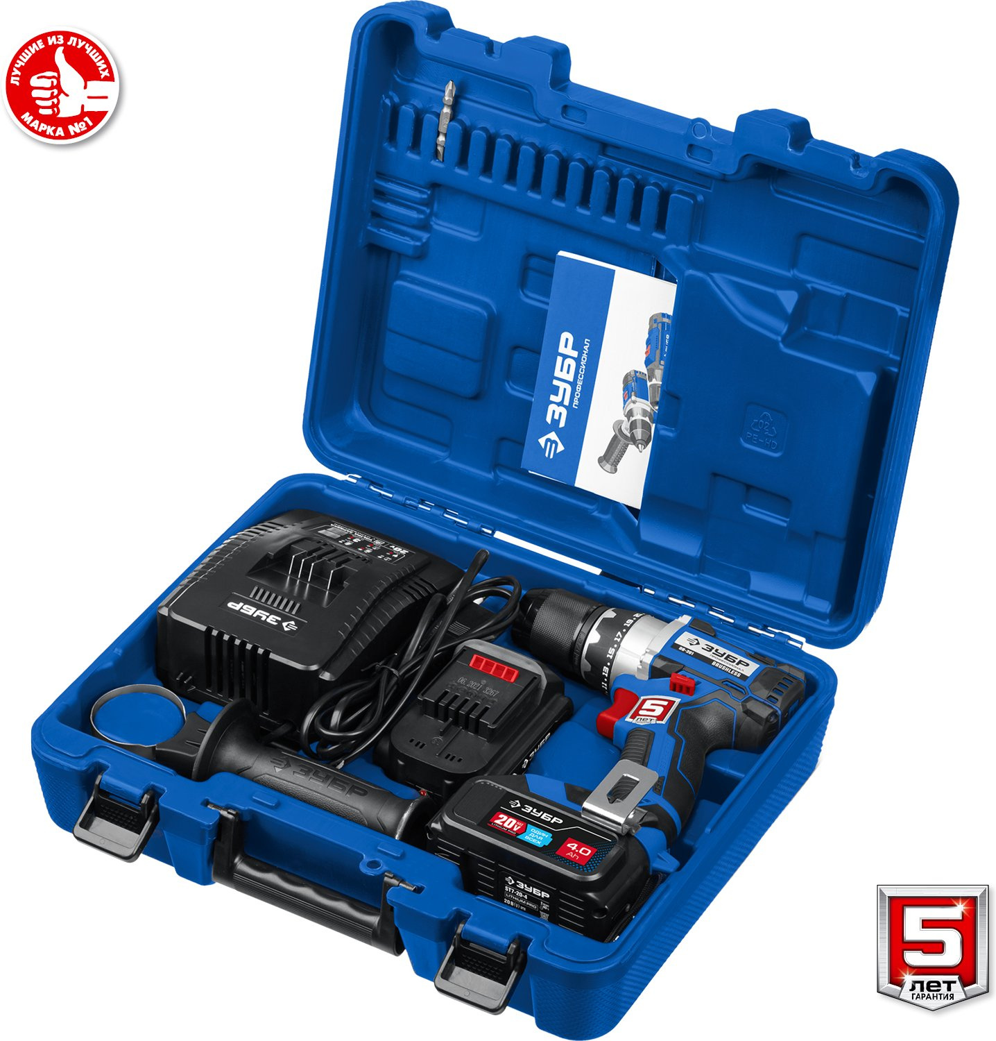 Аккумуляторная дрель-шуруповерт, аккумулятор - 2 шт., зарядное устройство, бита (PH; PZ), кейс, инструкции по безопасности, руководство по эксплуатации.