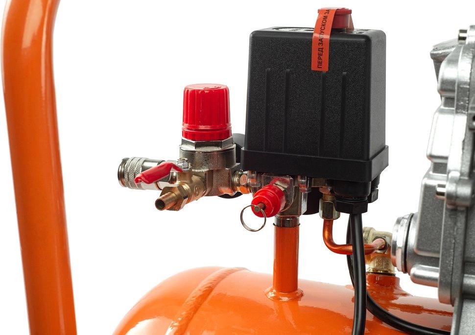 Манометр позволяет контролировать давление в ресивере и на выход. Через смотровое окно можно следить за уровнем масла в компрессоре. Электромеханический блок управления давлением в ресивере. Предохранительный механический клапан высокого давления. Дренажный клапан для слива конденсата.