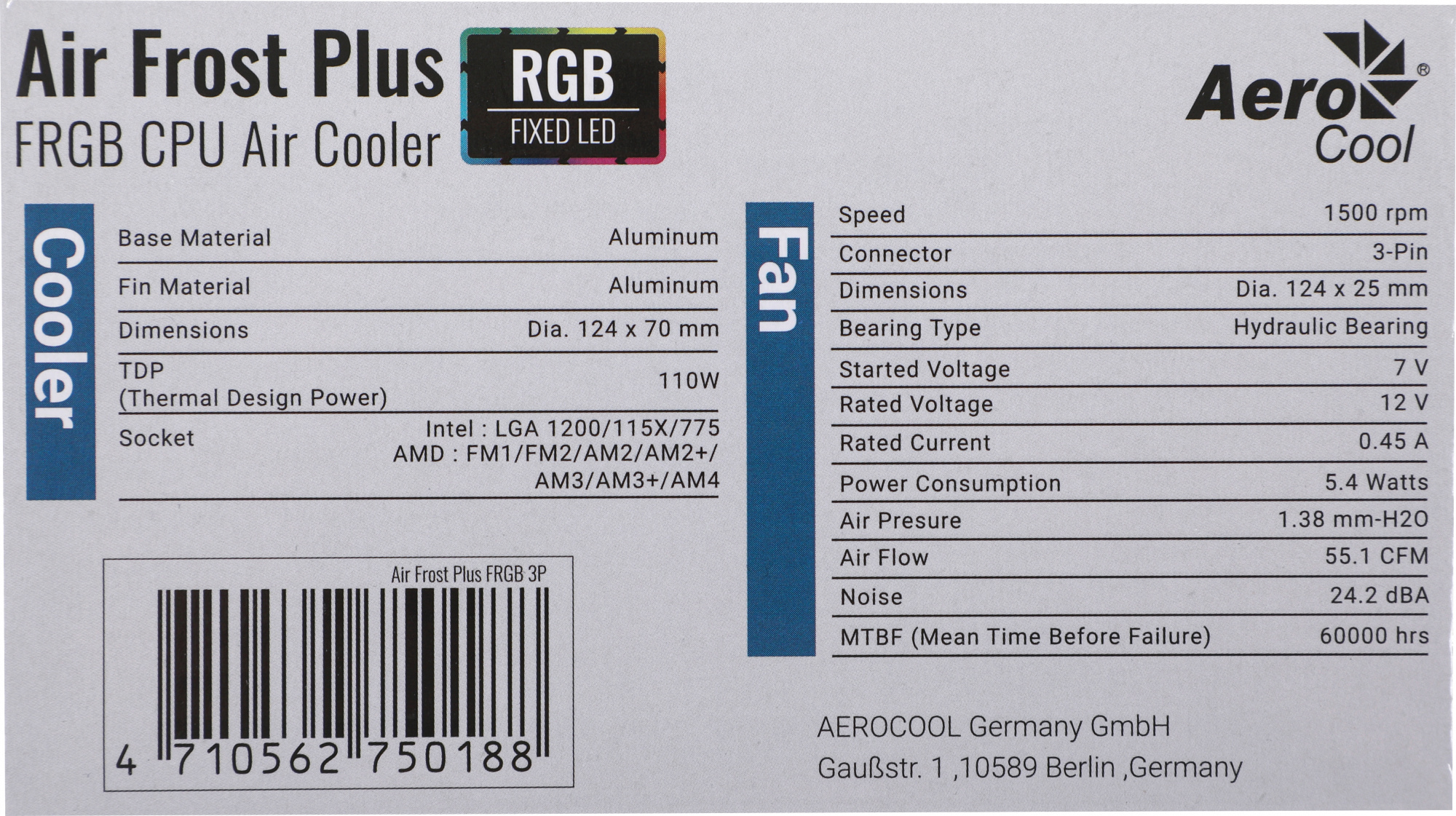 Устройство охлаждения(кулер) Aerocool Air Frost Plus RGB Soc-AM5/AM4/1200/1700/1851 черный 3-pin 24dB Al 110W 360gr Ret (AIR FROST PLUS FRGB 3P)