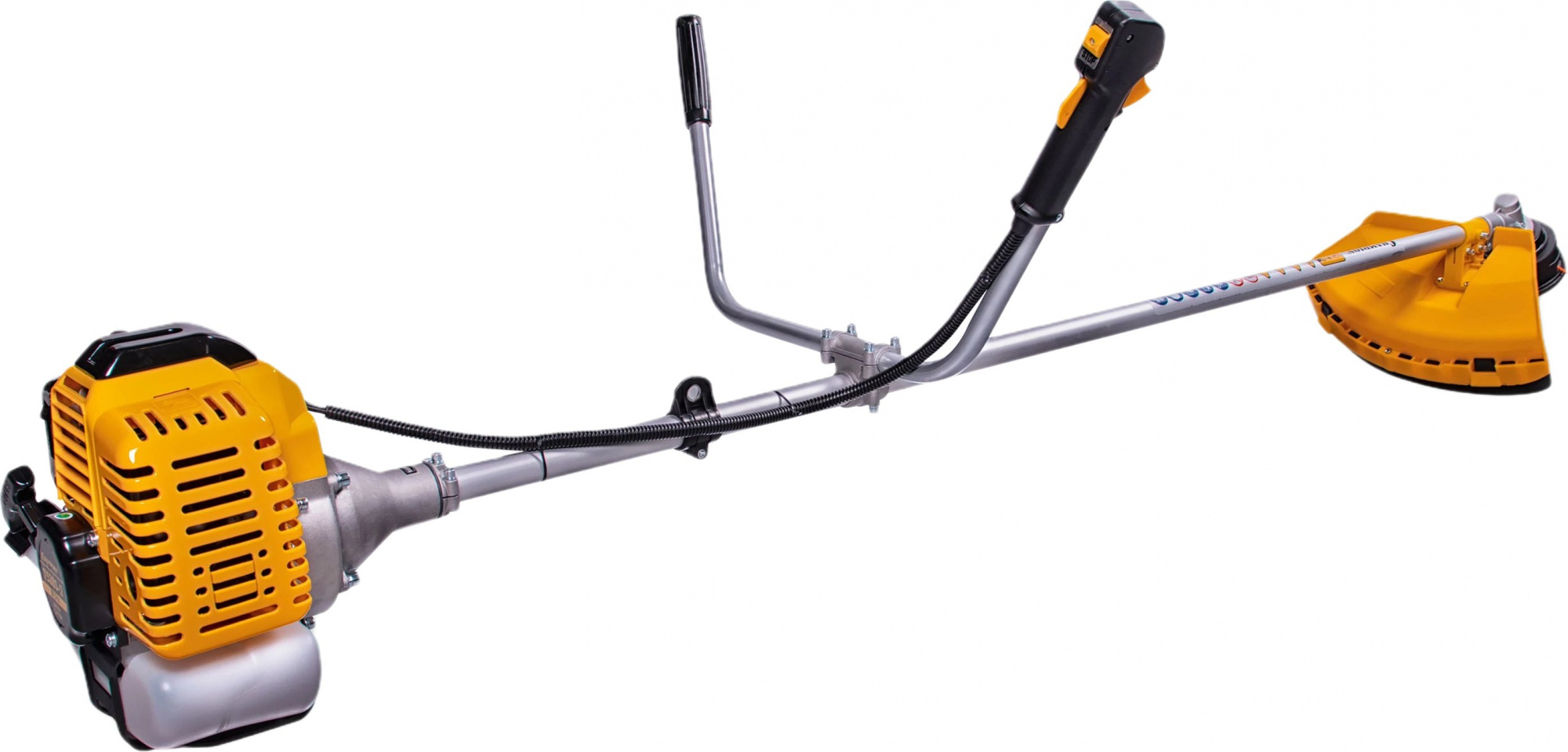 Двигатель, штанга, рукоятка управления, рукоятка левая, ремень, диск, головка триммерная, кожух защитный, ключ комбинированный, ключ шестигранный (4 мм.), ключ шестигранный (5 мм.), хомуты - 2 шт., емкость для приготовления топливной смеси, руководство по эксплуатации, упаковка.