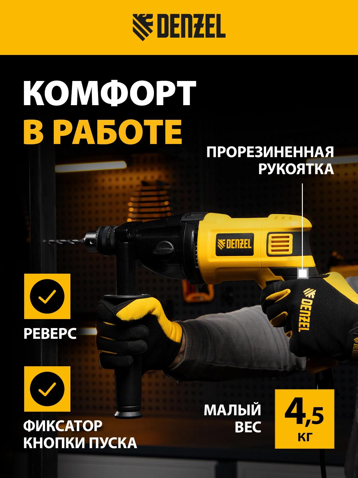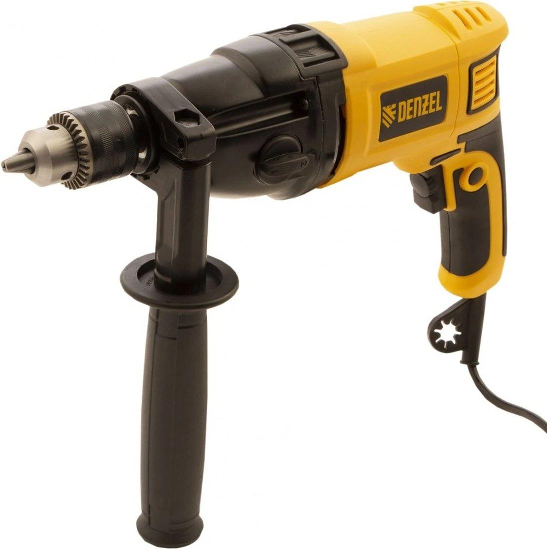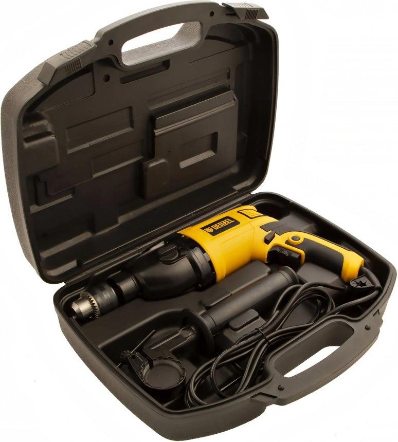 Дрель электрическая ударная, ключ от патрона, рукоятка боковая, ограничитель глубины сверления, комплект запасных угольных щеток, инструкция, гарантийный талон.