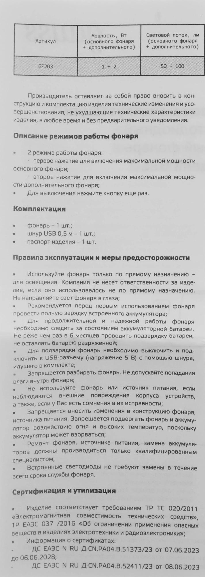 фонарь, USB шнур 0.5 м, паспорт
