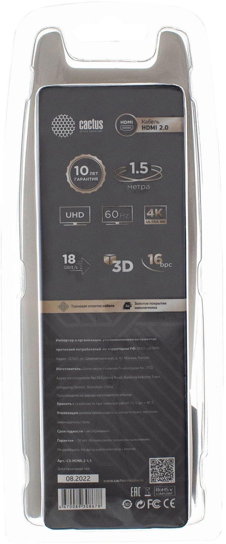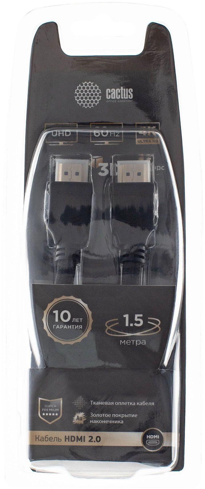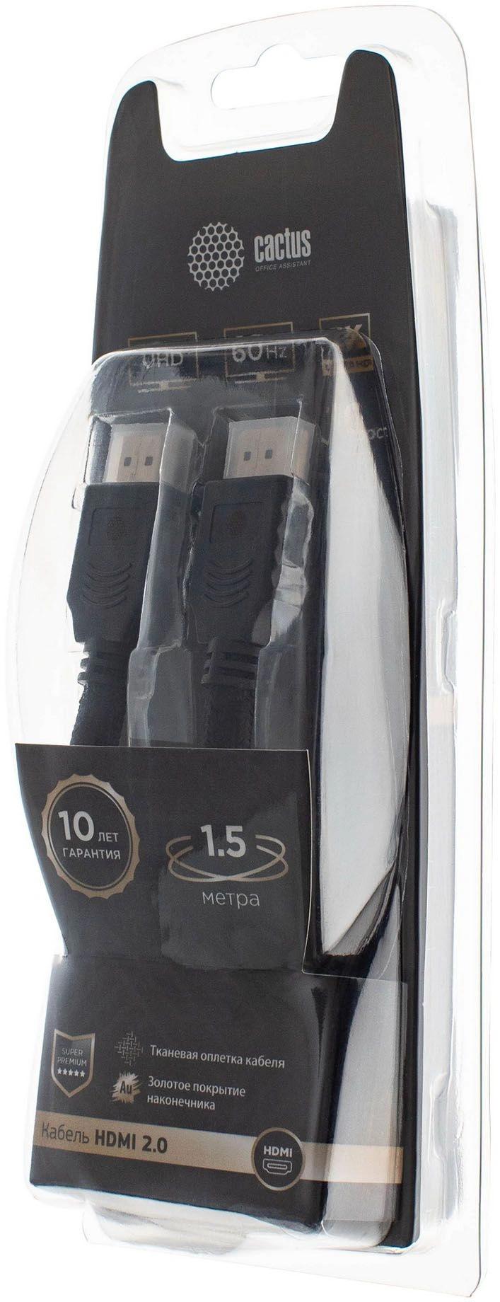 Кабель аудио-видео Cactus CS-HDMI.2-1.5 HDMI (m)/HDMI (m) 1.5м. позолоч.конт. черный