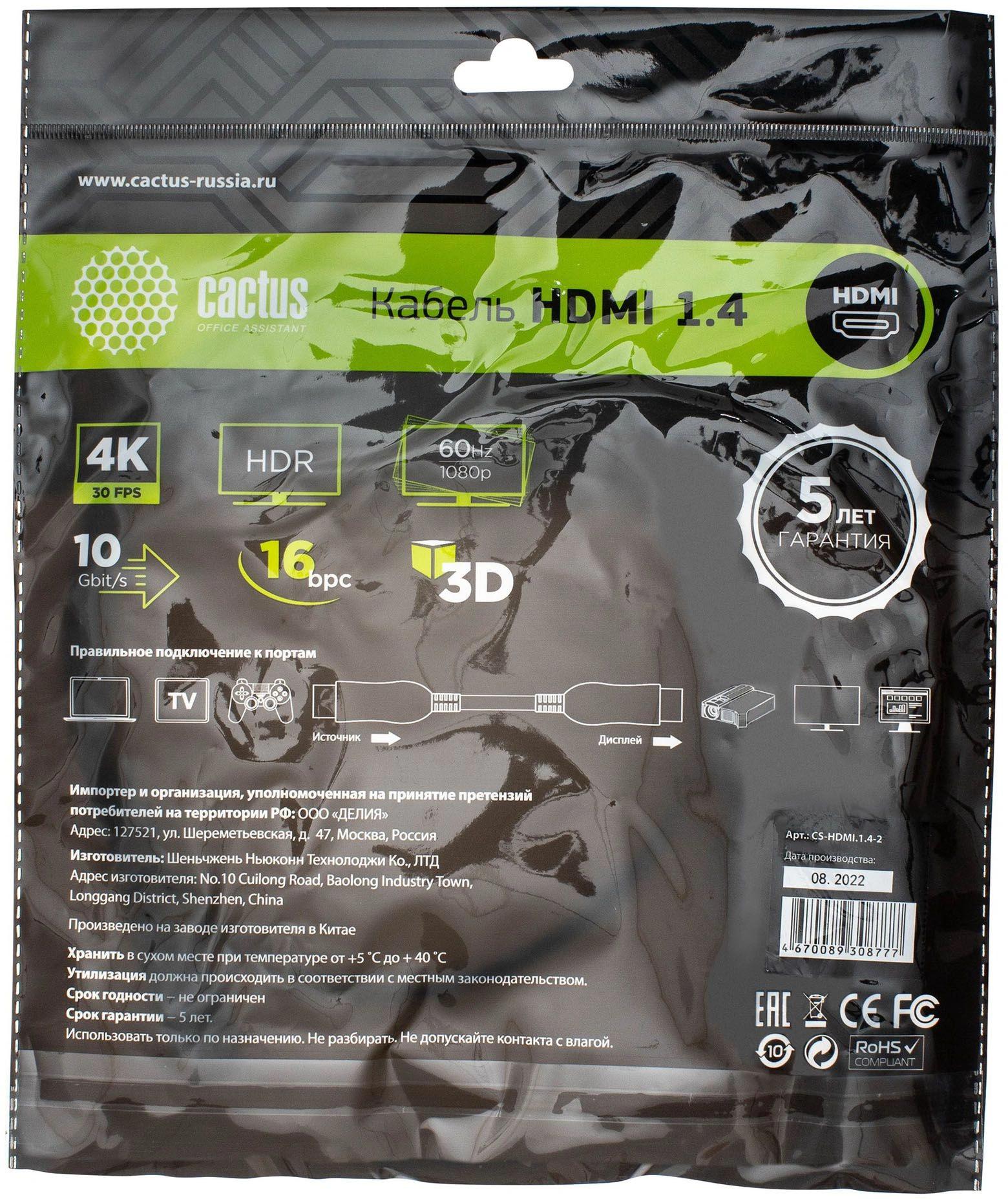 Кабель аудио-видео Cactus CS-HDMI.1.4-2 HDMI (m)/HDMI (m) 2м. позолоч.конт. черный