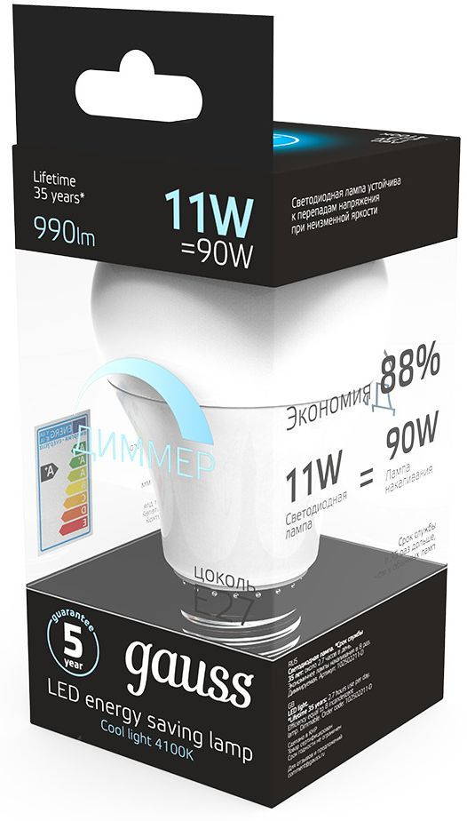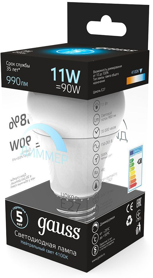 Лампа светодиодная Gauss 102502211-D 11Вт цок.:E27 груша 220B 4100K св.свеч.бел.нейт. A60 (упак.:1шт)