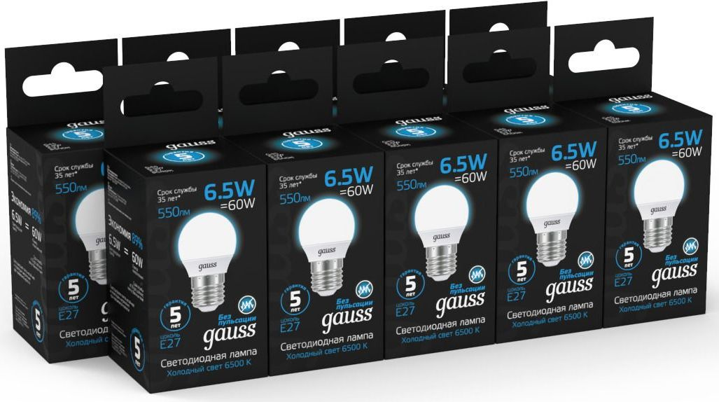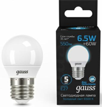 Лампа светодиодная Gauss 105102307 6.5Вт цок.:E27 шар 220B 6500K св.свеч.бел.хол. (упак.:10шт)