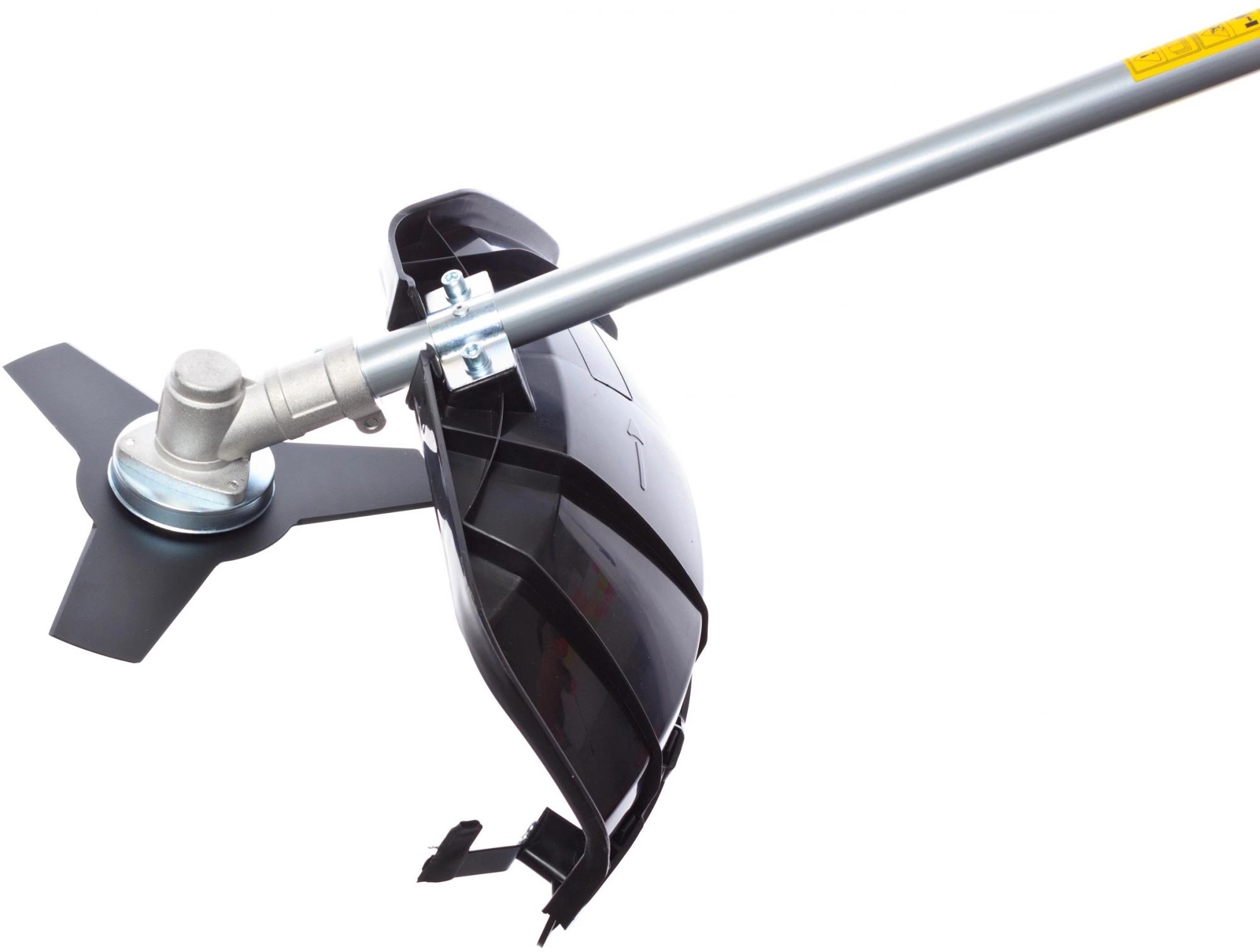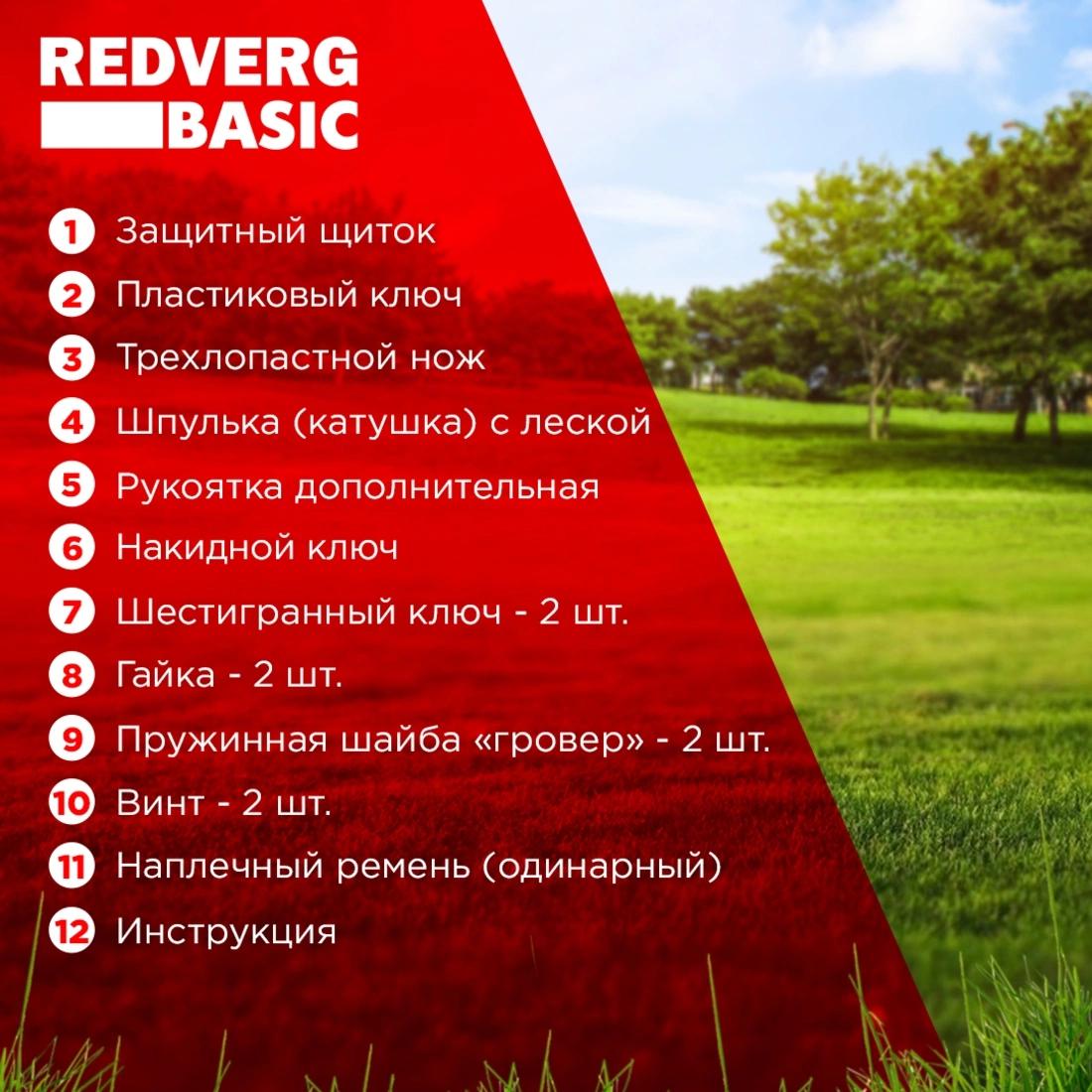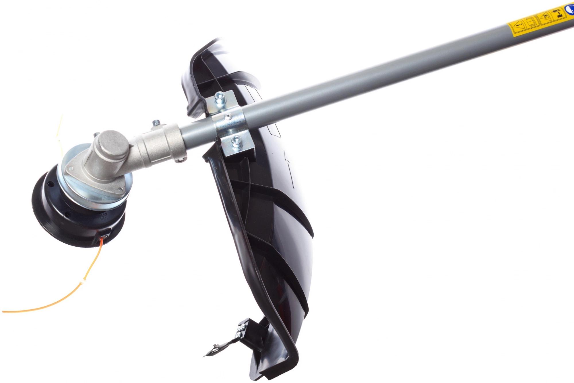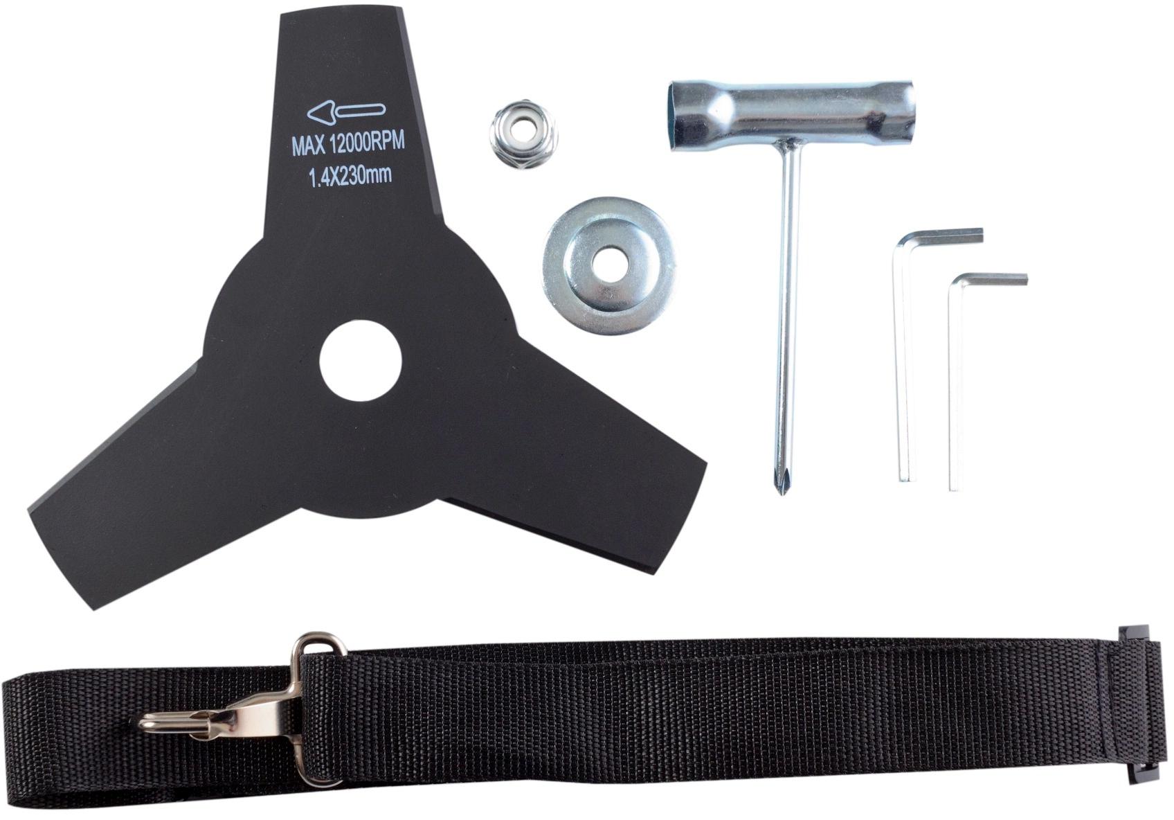 Защитный щиток; пластиковый ключ; шпулька (катушка) с леской; трехлопастной нож; рукоятка дополнительная; накидной ключ; шестигранный ключ - 2 шт.; гайка - 2 шт.; пружинная шайба «гровер» - 2 шт.; винт - 2 шт.; наплечный ремень (одинарный).