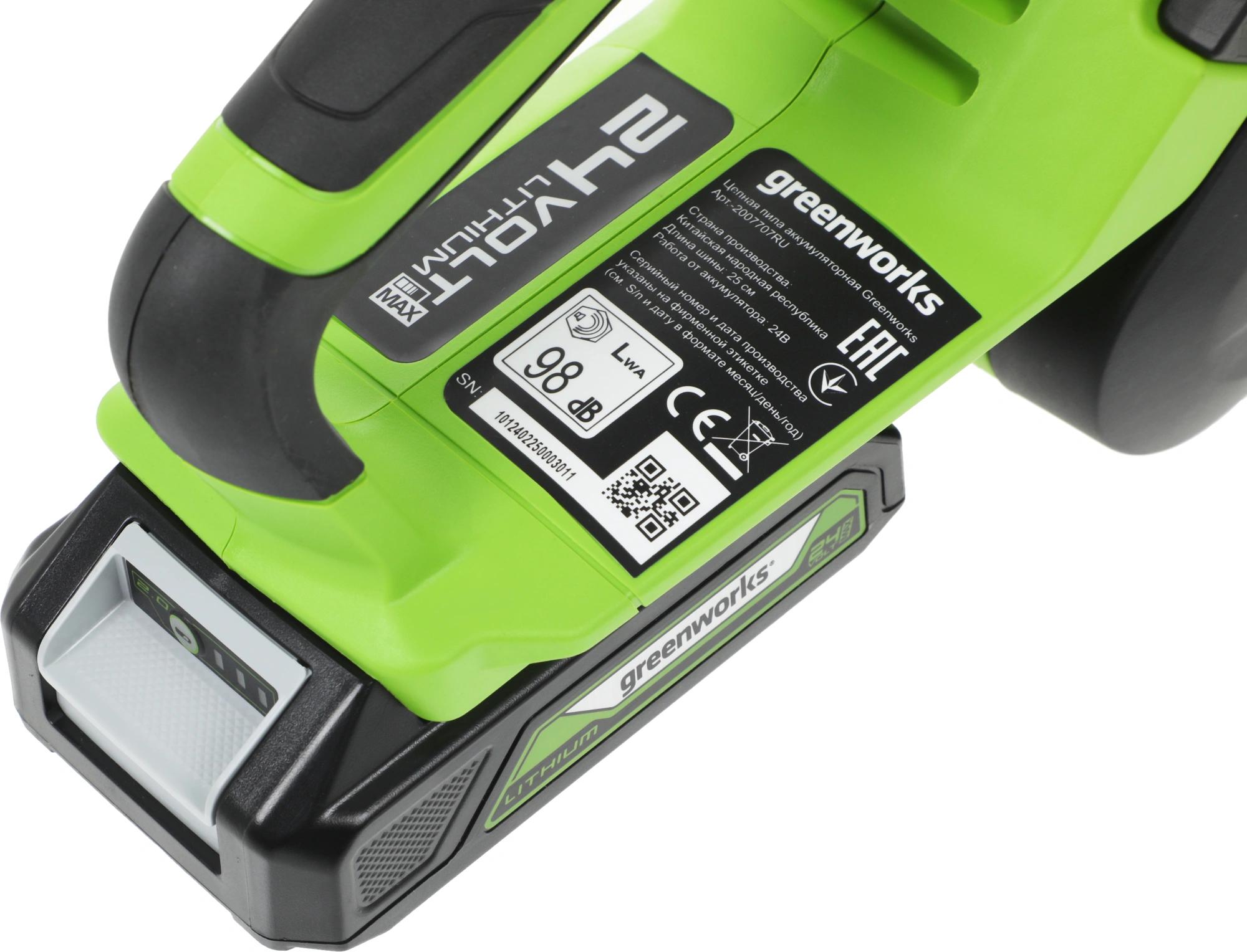 Аккумуляторная цепная пила 25 см. арт. 2007707; аккумулятор Greenworks 24V 2A*ч; зарядное устройство Greenworks 24V; руководство по эксплуатации; гарантийный талон.