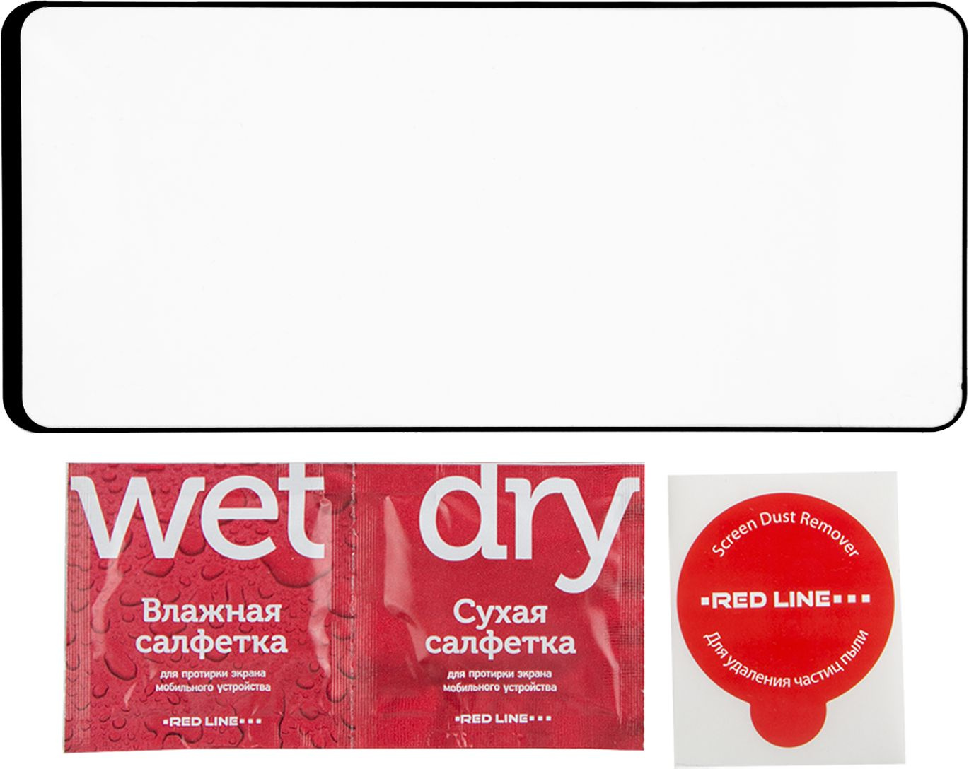 В комплект поставки входит: Защитное стекло, Влажная салфетка, Салфетка из микрофибры, Стикеры для удаления пыли с экрана, Стикеры для фиксации стекла на экране смартфона.