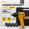 Двойной Молот (Twin Hammer), удобный корпус для комфортной работы, 10 режимов (5 вперед + 5 назад), набор из 8 головок, штуцер в комплекте, удобный кейс для переноски пневмоинструмента.