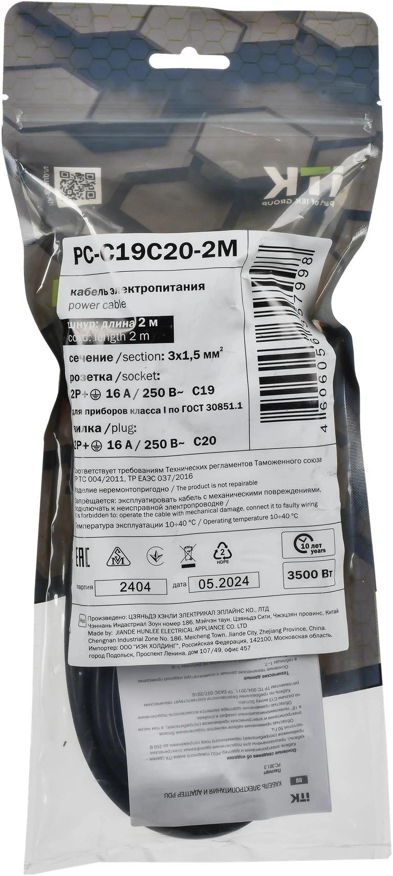 Шнур питания ITK PC-C19C20-2M C19-C20 проводник.:3x1.5мм2 2м 230В 10А черный