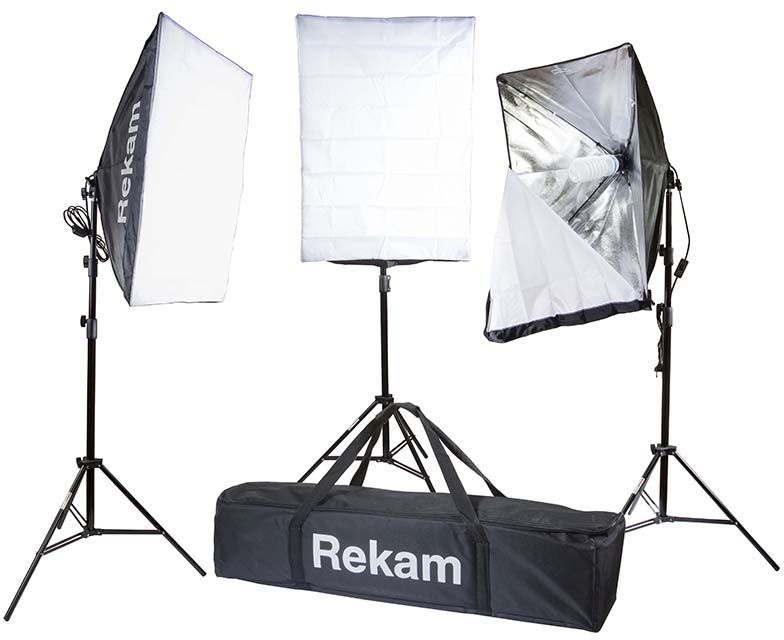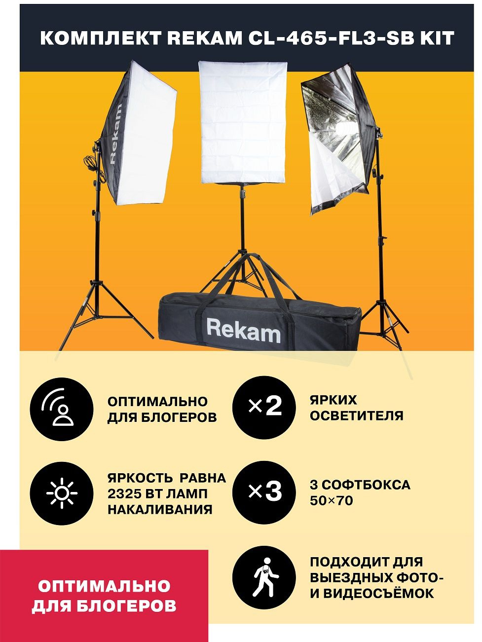 Осветитель Rekam FL1S (патрон Е27 с выключателем) с несъёмным софтбоксом (внутренняя поверхность – серебряного цвета) 50х70х40 см - 3 шт. Стойка 3-х секционная Rekam LS3-213-2 с максимальной высотой 213 см и нагрузкой до 2 Кг - 3 шт. Лампа флуоресцентная - 3 шт. Сумка тканевая. Инструкция