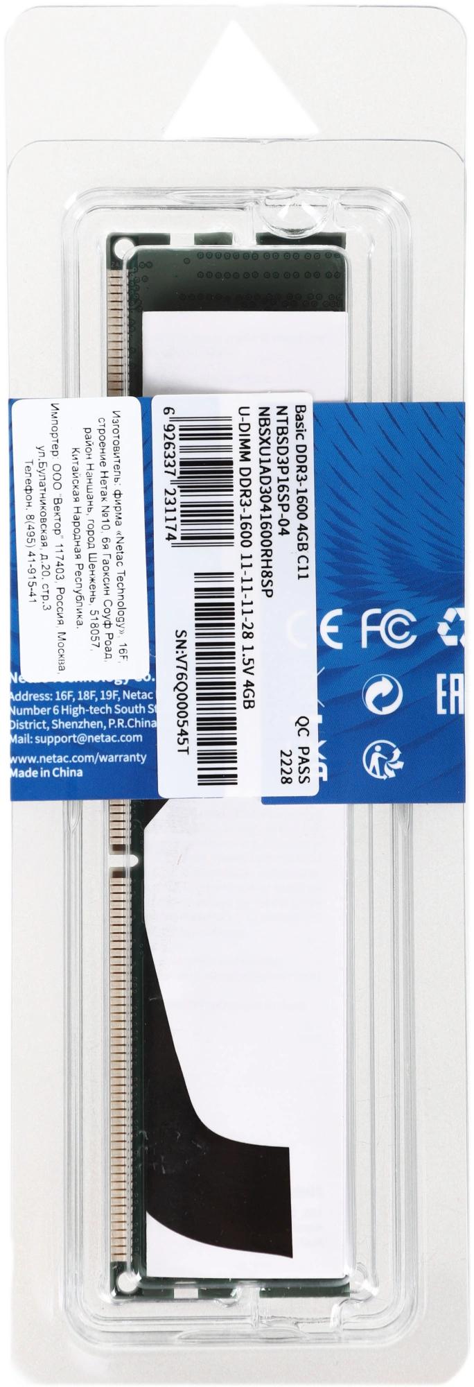 Память DDR3 4GB 1600MHz Netac NTBSD3P16SP-04 Basic RTL PC3-12800 CL11 DIMM 240-pin 1.5В dual rank Ret