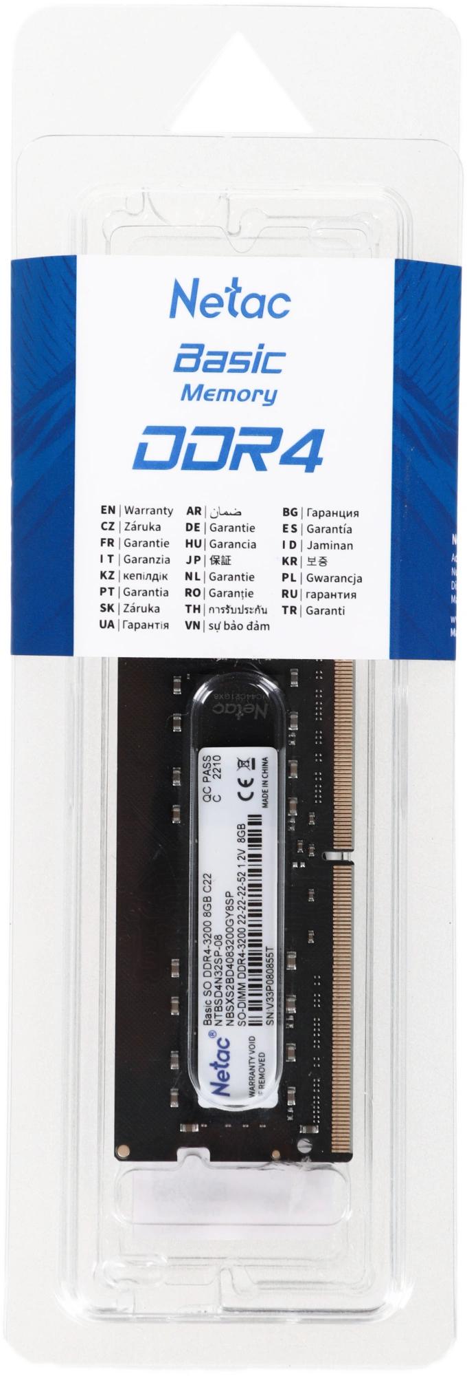 Память DDR4 8Gb 3200MHz Netac NTBSD4N32SP-08 Basic RTL PC4-25600 CL22 SO-DIMM 260-pin 1.2В single rank Ret
