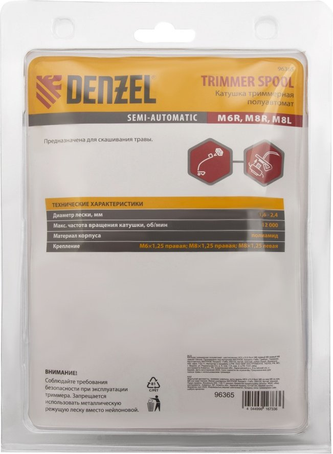 Полуавтоматическая катушка для триммера Denzel 96365 устанавливается на любые марки электрических и бензиновых кос с креплением на оси НЕХ х 15/6. Режущая леска сечением до 2 мм. обеспечивает комфортное скашивание молодой травы на приусадебном участке.