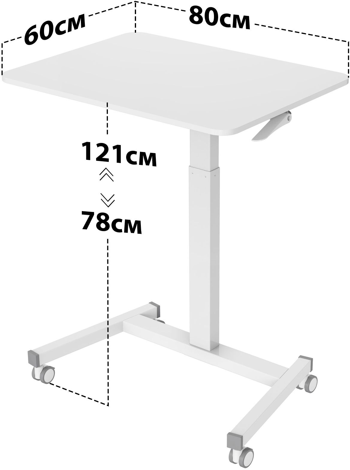 Простое управление: подъемный механизм плавно опускает и поднимает столешницу, можно остановить в любом положении. Управление при помощи одного рычага, комфортный и безопасный выбор удобного положения. Наличие 4 колес обеспечивает маневренность, 2 колеса со стопором, для придания устойчивости.
