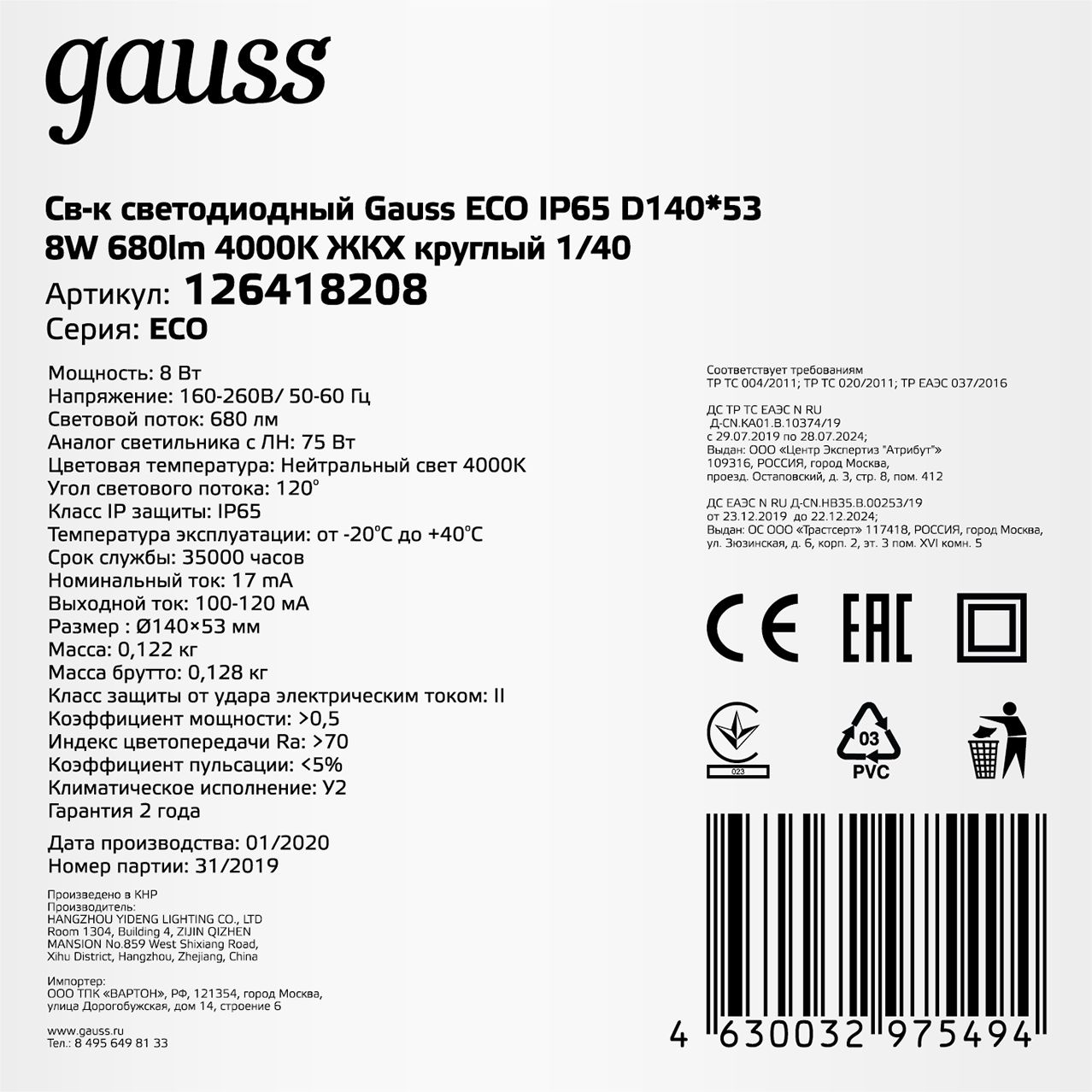 Светильник Gauss ЖКХ 126418208 8Вт 4000K белый опал