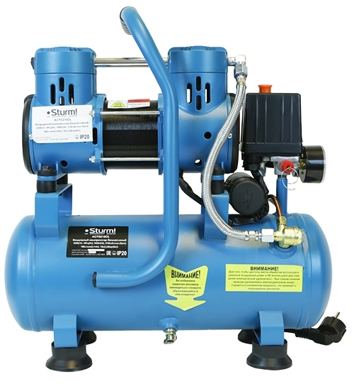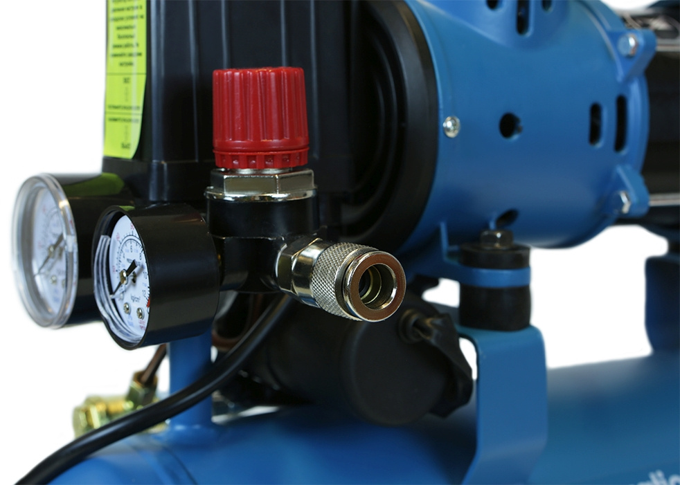 Безмасляный компрессор с 2-х цилиндровым мотором с пониженным уровнем шума, с увеличенным количеством оборотов 2600 об/мин, с двумя шлангами для нагнетания давления обеспечивает поднятие давления в 10-ти литровом ресивере с 0 до 8 атмосфер за 1 минуту.