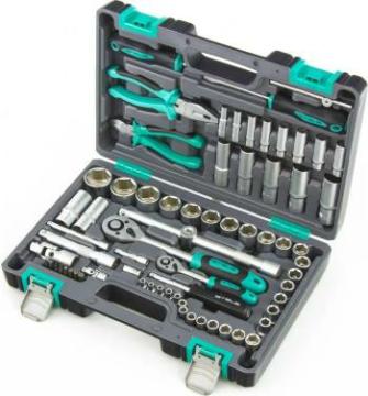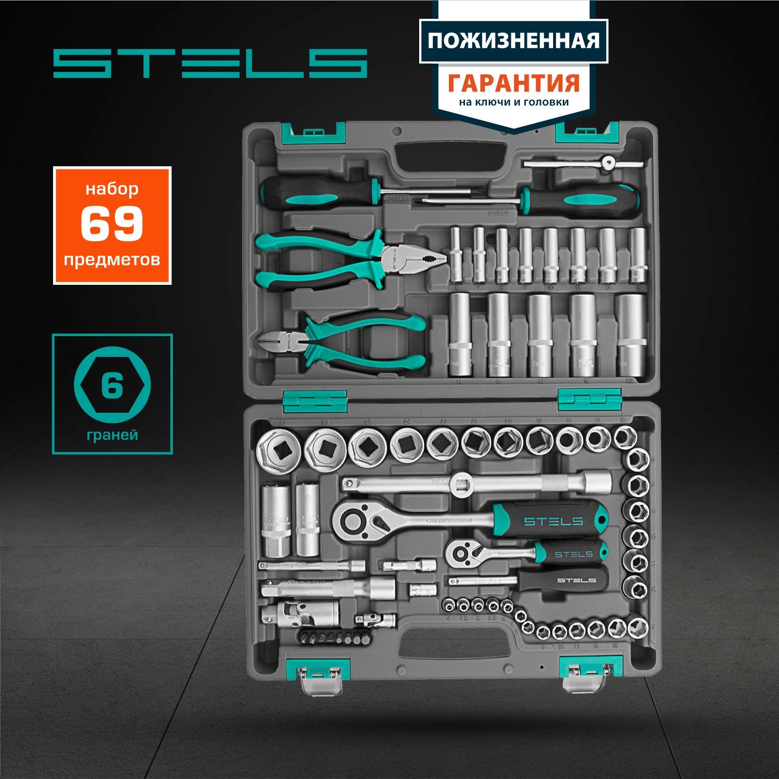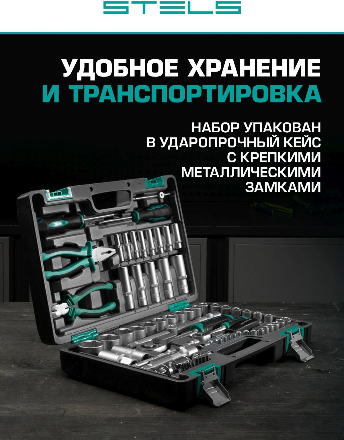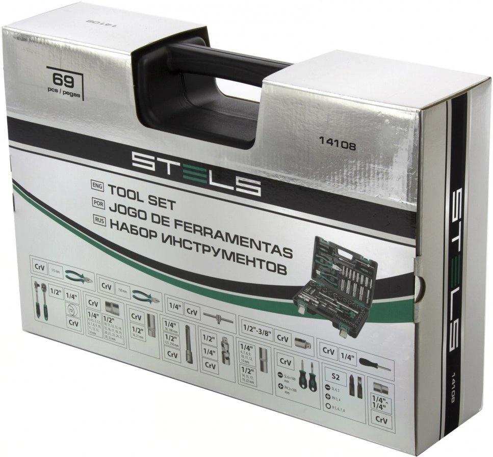 Набор инструментов Stels 14108, 1/2 и 1/4 дюйма, CrV, состоит из 69 предметов в пластиковом кейсе и предназначен для выполнения слесарно-монтажных работ. Включает инструменты и насадки для работы с резьбовыми крепежами, а также бокорезы и пассатижи, расширяющие возможности использования набора.