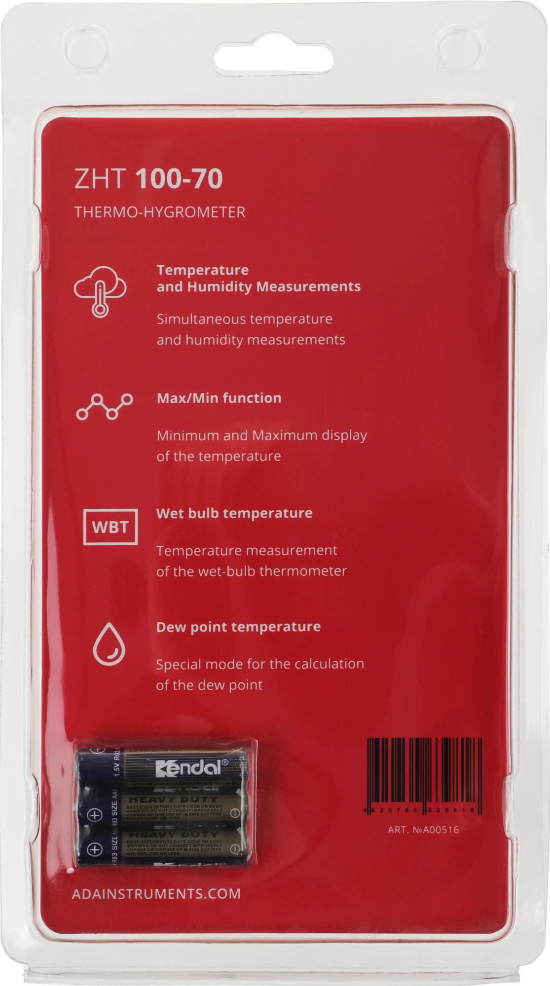 Измеритель влажности и температуры ADA ZHT 100-70 - цифровой прибор для измерения влажности и температуры 2 в 1! Разработан для совмещения функций измерителя влажности и измерителя температуры. Этот прибор идеально подходит для практического применения как в профессиональной деятельности.