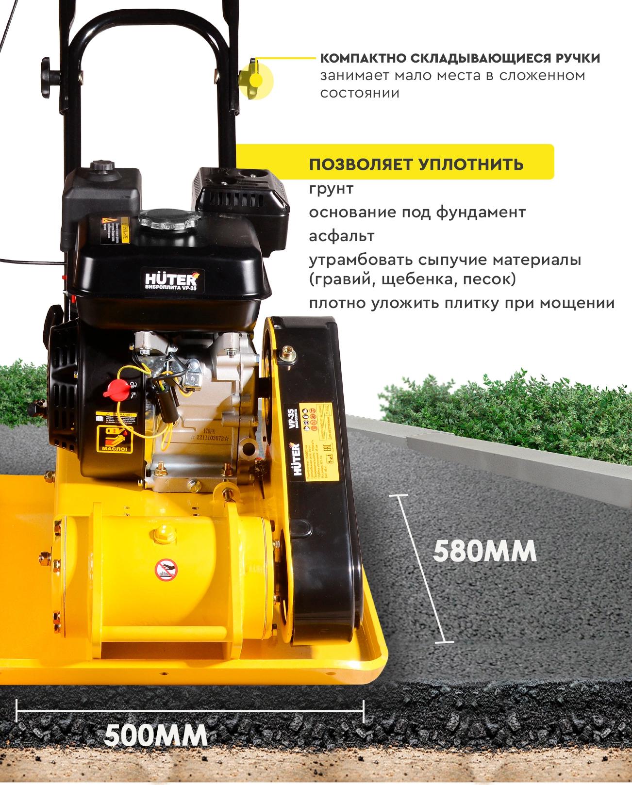 Виброплита VP-35 позволяет уплотнить грунт, основание под фундамент, асфальт, утрамбовать сыпучие материалы (гравий, щебенка, песок), плотно уложить плитку при мощении.
