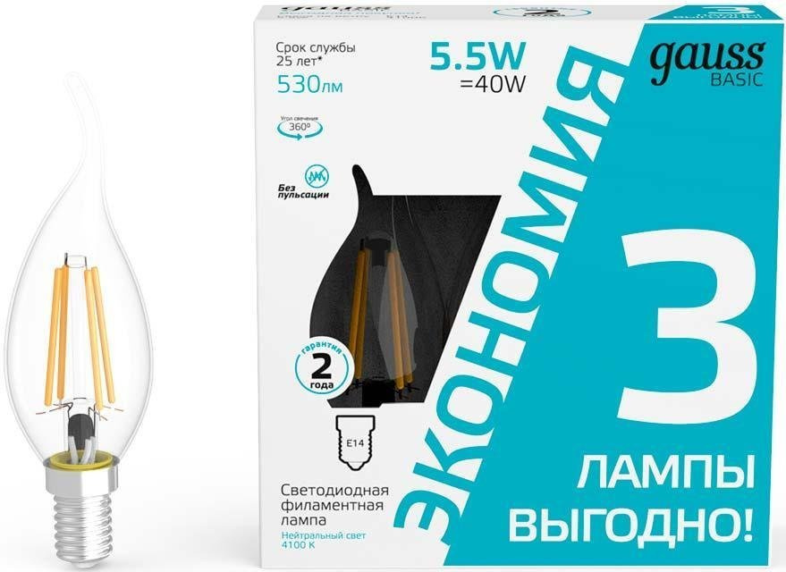 Лампа светодиодная Gauss Basic 1041126T 5.5Вт цок.:E14 свеча 220B 4100K св.свеч.бел.нейт. (упак.:3шт)