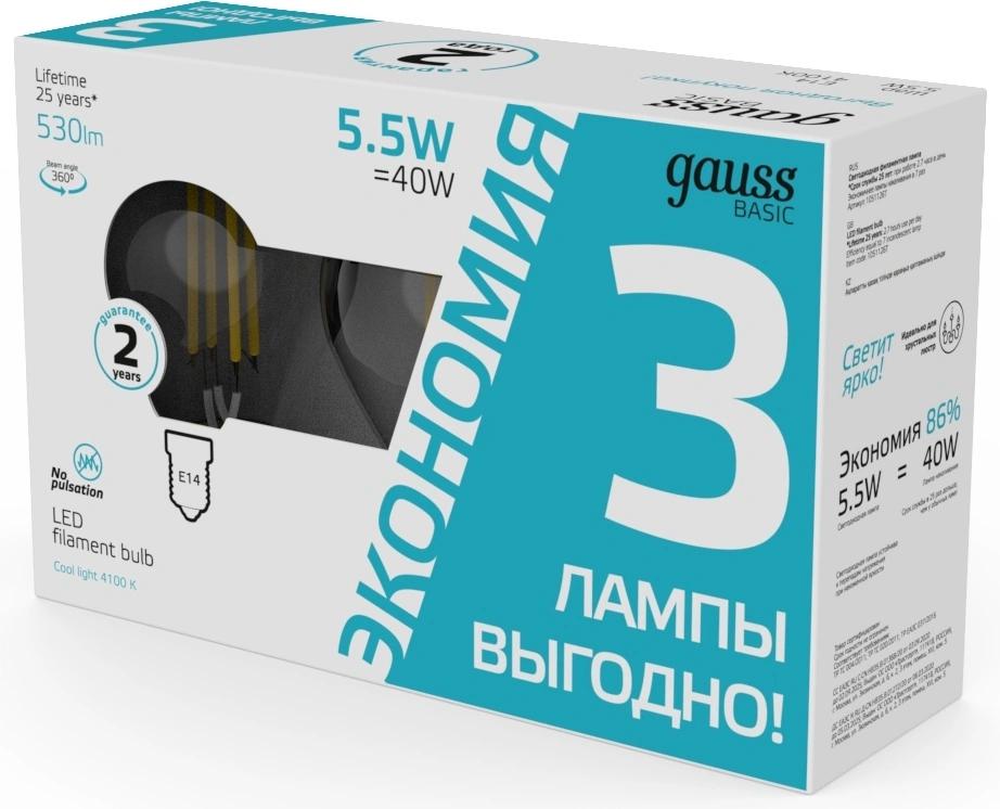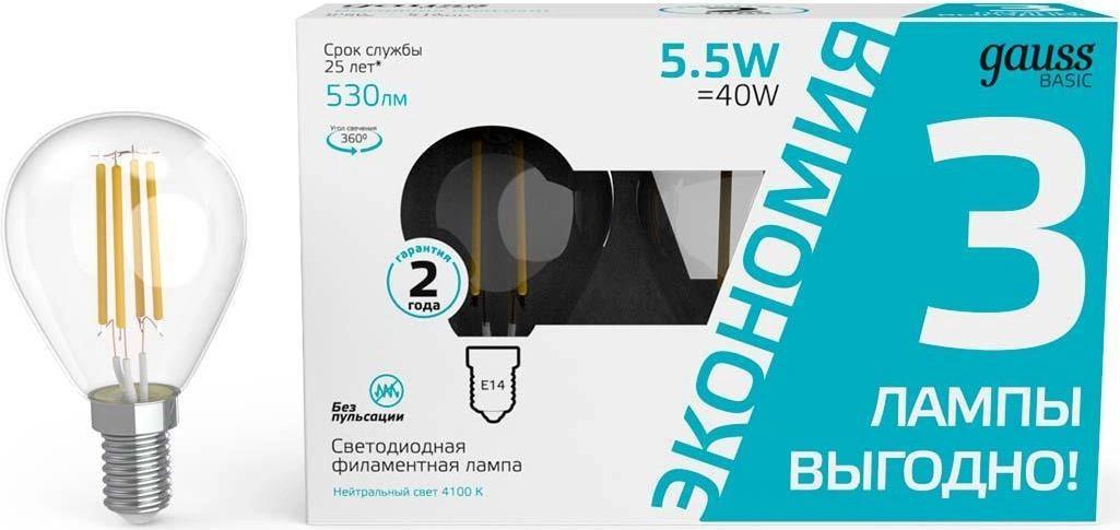Лампа светодиодная Gauss Basic 1051126T 5.5Вт цок.:E14 шар 220B св.свеч.бел.нейт. (упак.:3шт)