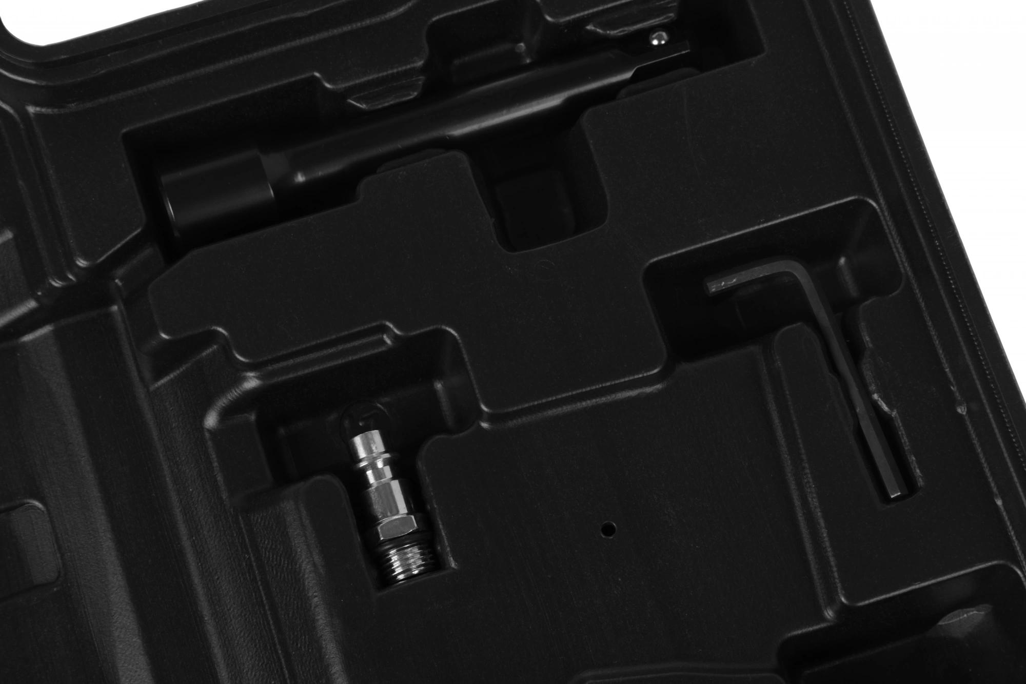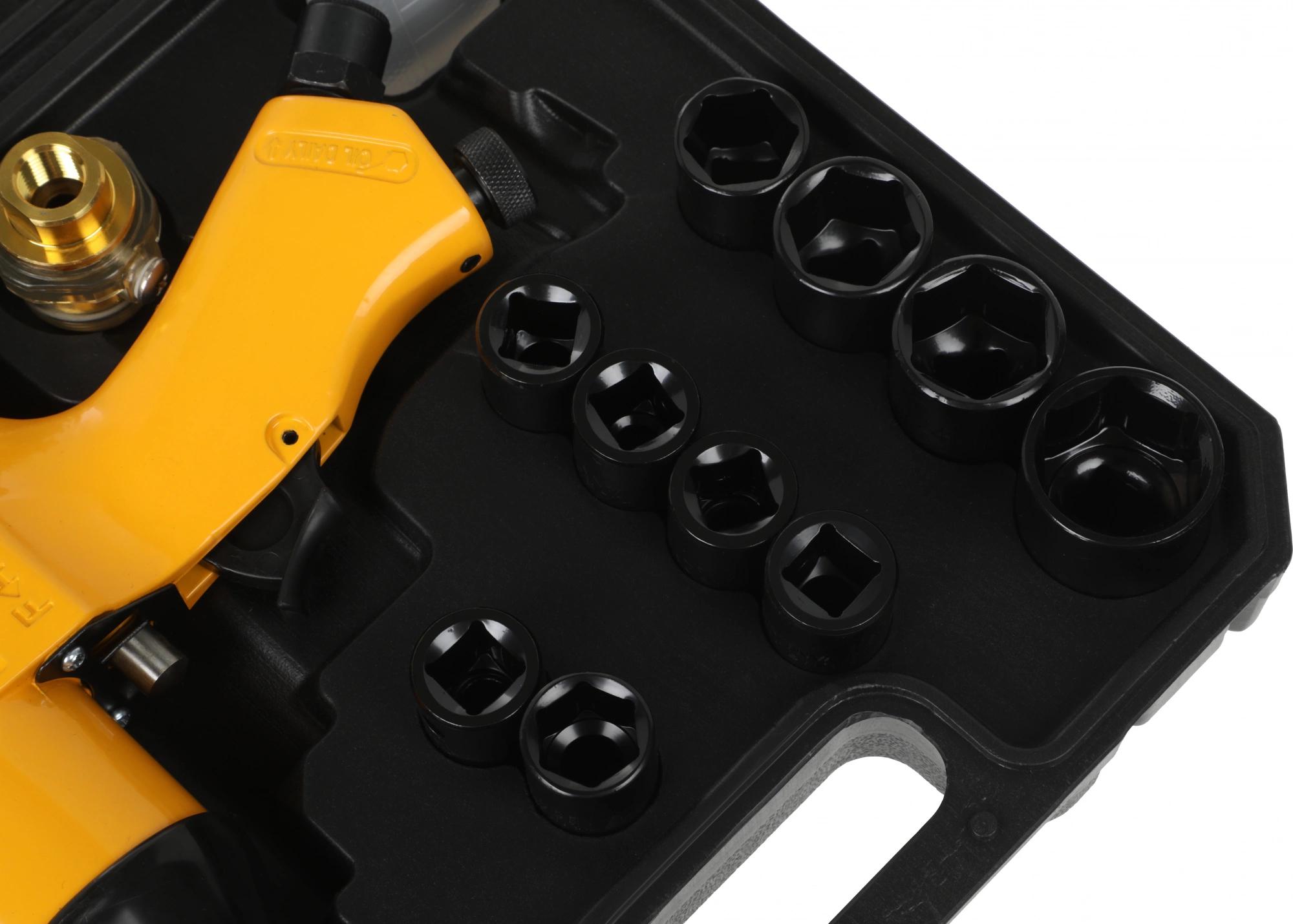 Гайковерт пневматический, набор головок в комплекте 9, 10, 11, 13, 14, 17, 19, 22, 24, 27 мм., документация, масленка, удлинитель, шестигранный ключ, набор головок, боек, чемодан, быстросъемный штуцер.