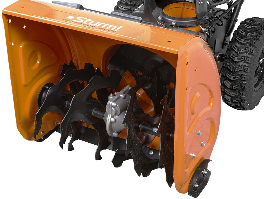 Надежный зимний двигатель с защитой от низкого уровня масла. Большой ковш 57*56 см с полозьями скольжения обеспечивает внушительную ширину прохода и позволяет убирать сугробы до полуметра высотой. Агрессивные шнеки диаметром 300 мм/ легко справляются со слежавшимся снегом и настом.