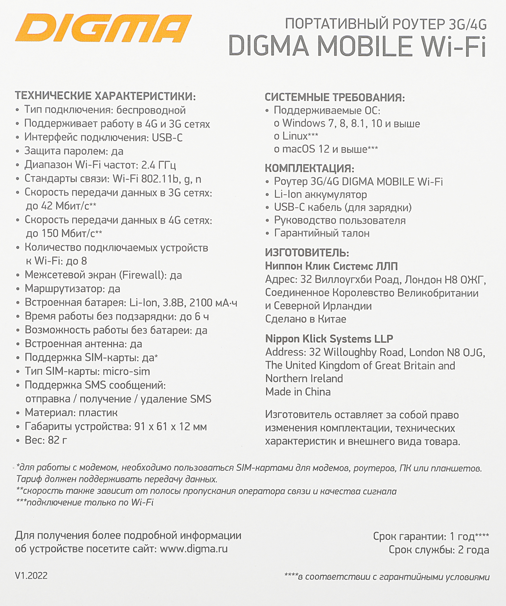 Портативный Wi-Fi-роутер со встроенным модемом 4G и батареей на 2100 мАч. Работает с SIM-картами любых операторов сотовой связи. Подключение до 8 пользователей. Время автономной работы - до 6 часов.