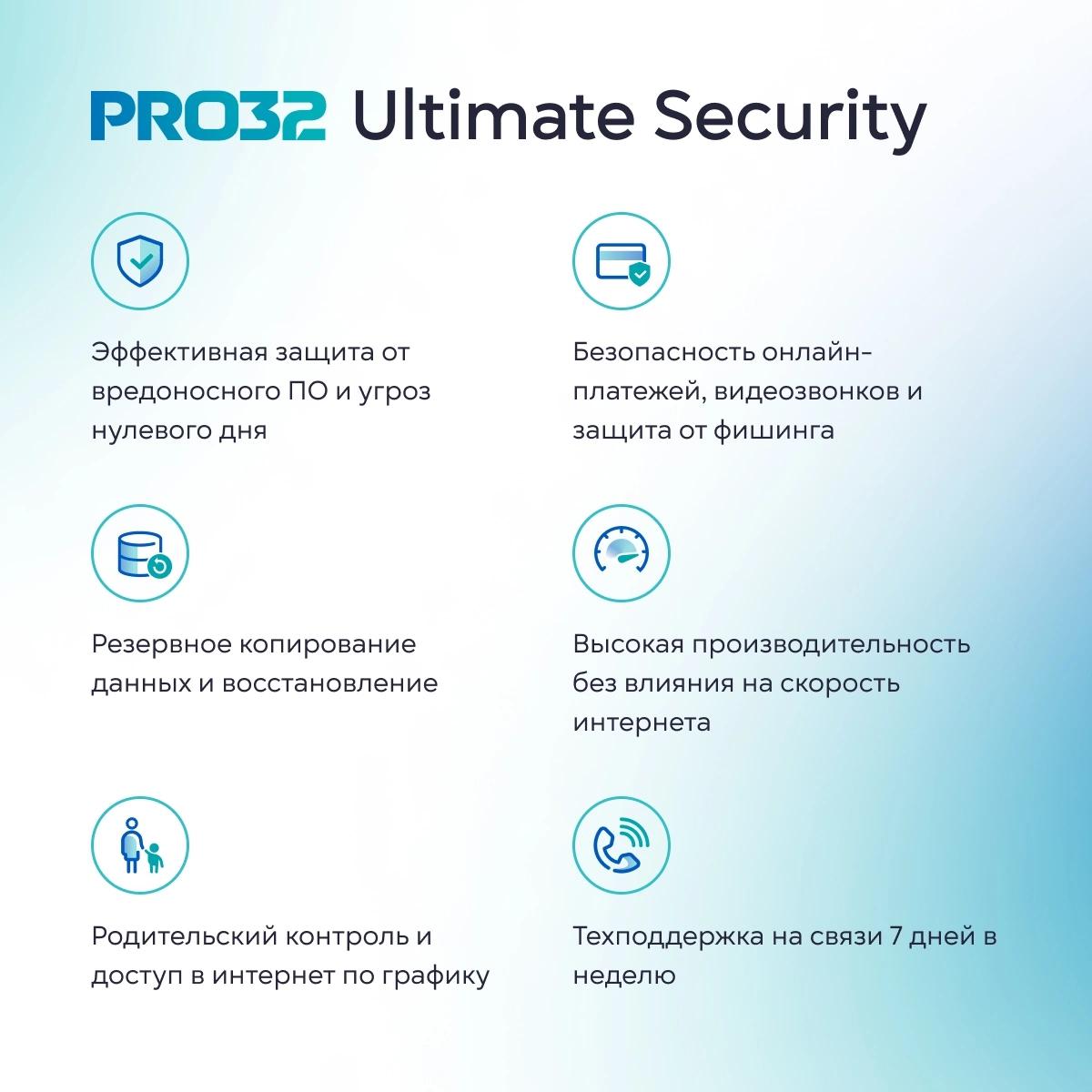 PRO32 Ultimate Security – единое решение кибербезопасности для всех устройств. Программный продукт обеспечивает безопасность компьютера и ноутбука на ОС Windows, а также мобильных девайсов Android при минимальных нагрузках на систему. Антивирус легко установить и настроить.