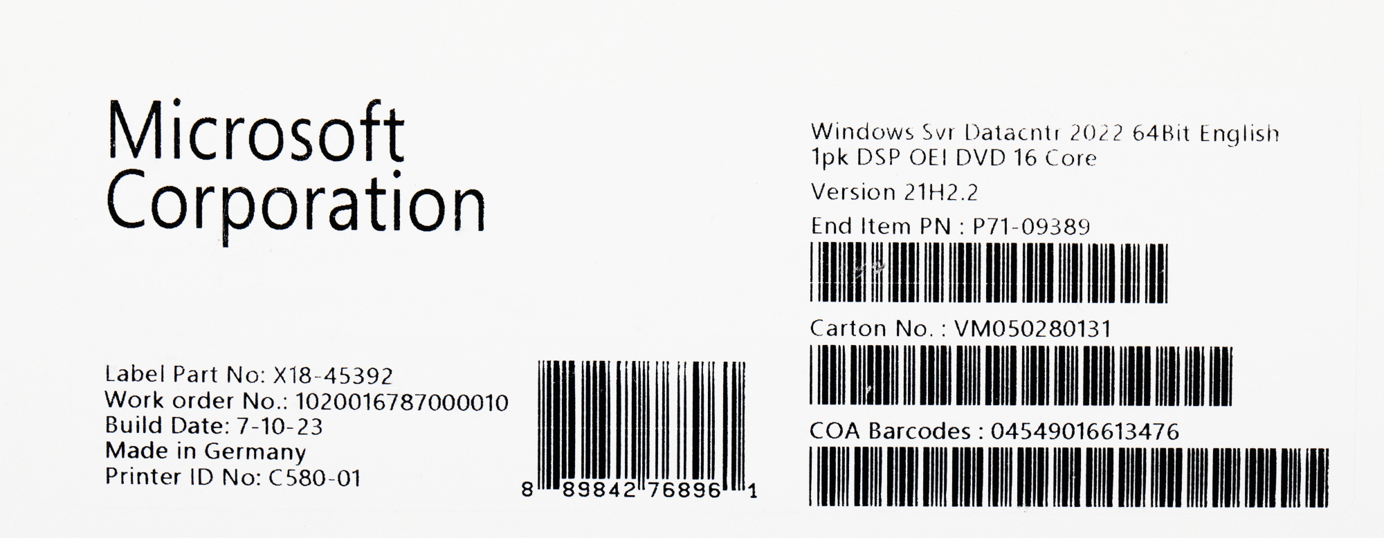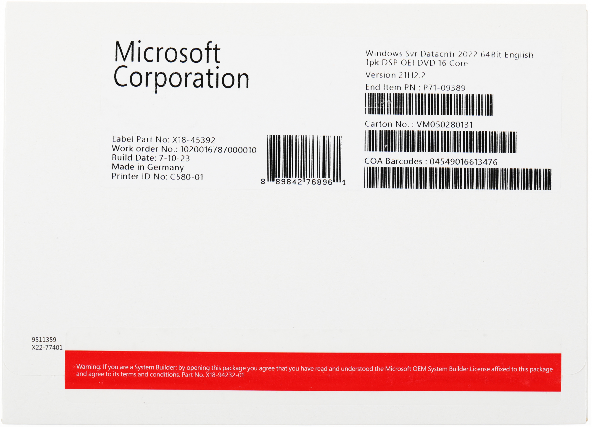 Операционная система Microsoft Windows Server Datacenter 2022 64Bit English 1pk DSP OEI DVD 16 Core (P71-09389)