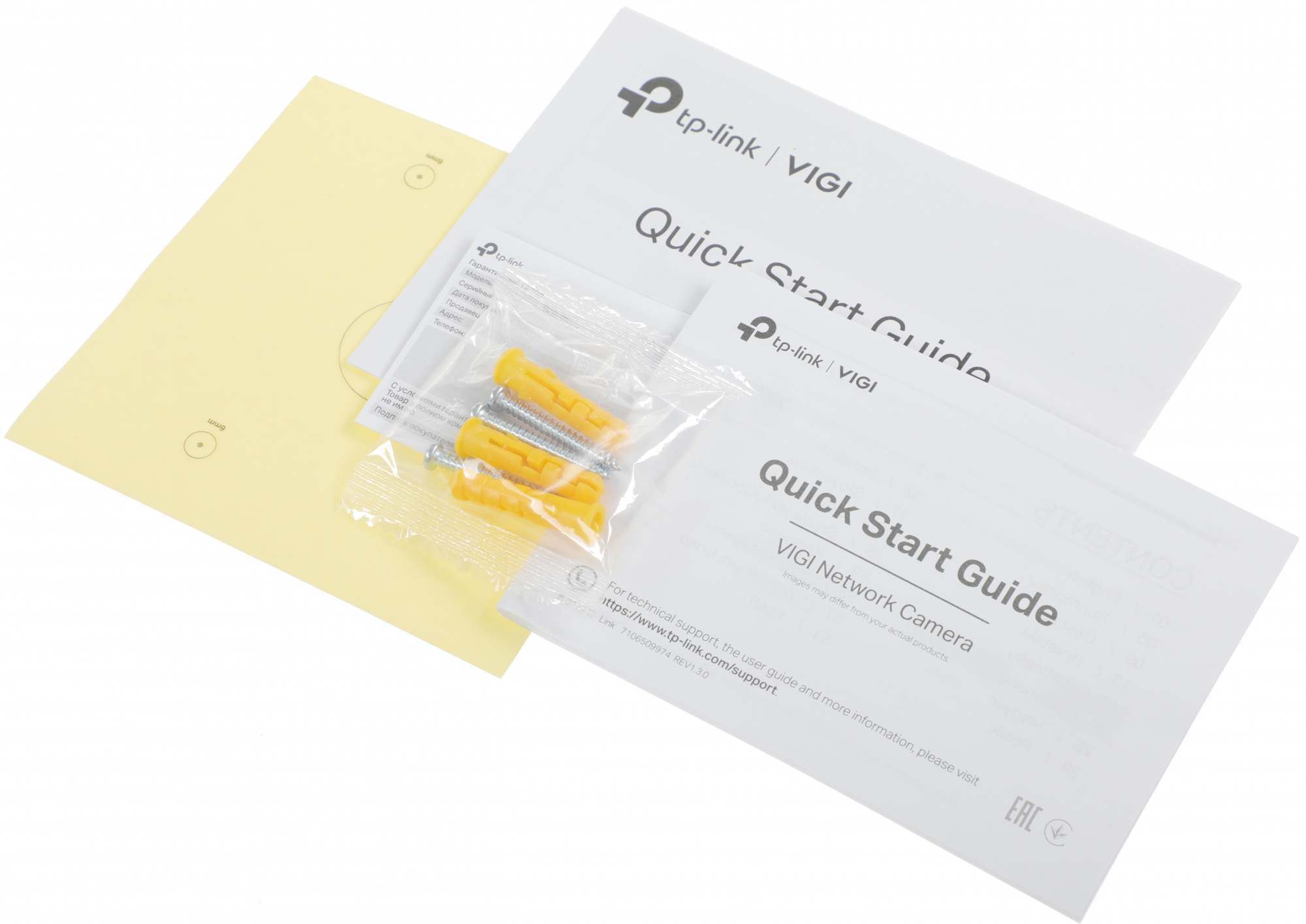 Камера, краткое руководство по началу работы, крепёжные принадлежности (винты, дюбели, шестигранный ключ).