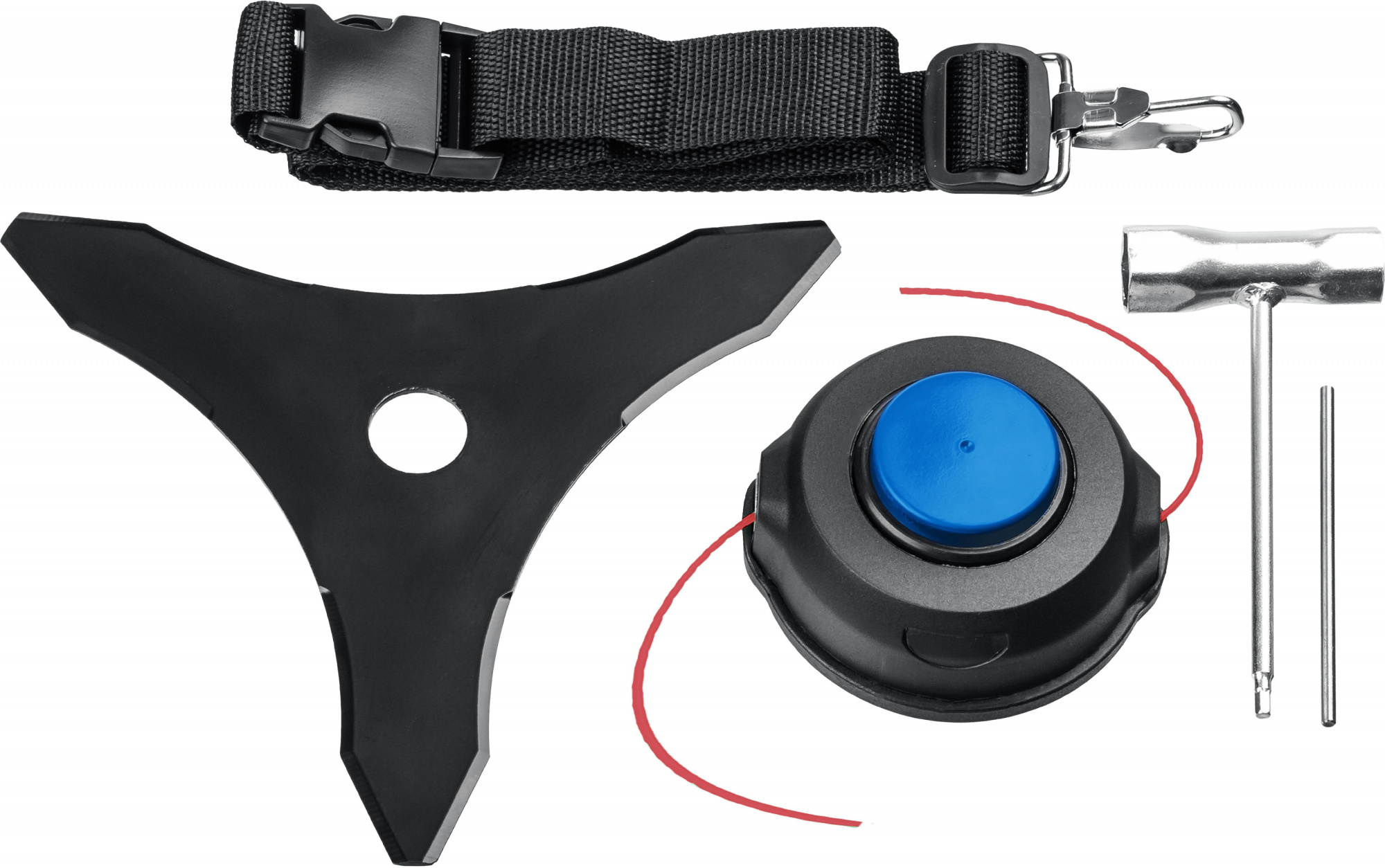 Коса. Кожух защитный. Катушка с леской. Нож. Плечевой ремень. Рукоятка с крепежом. Ключ. Стопор. Руководство по эксплуатации
